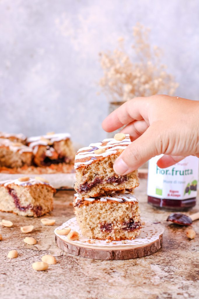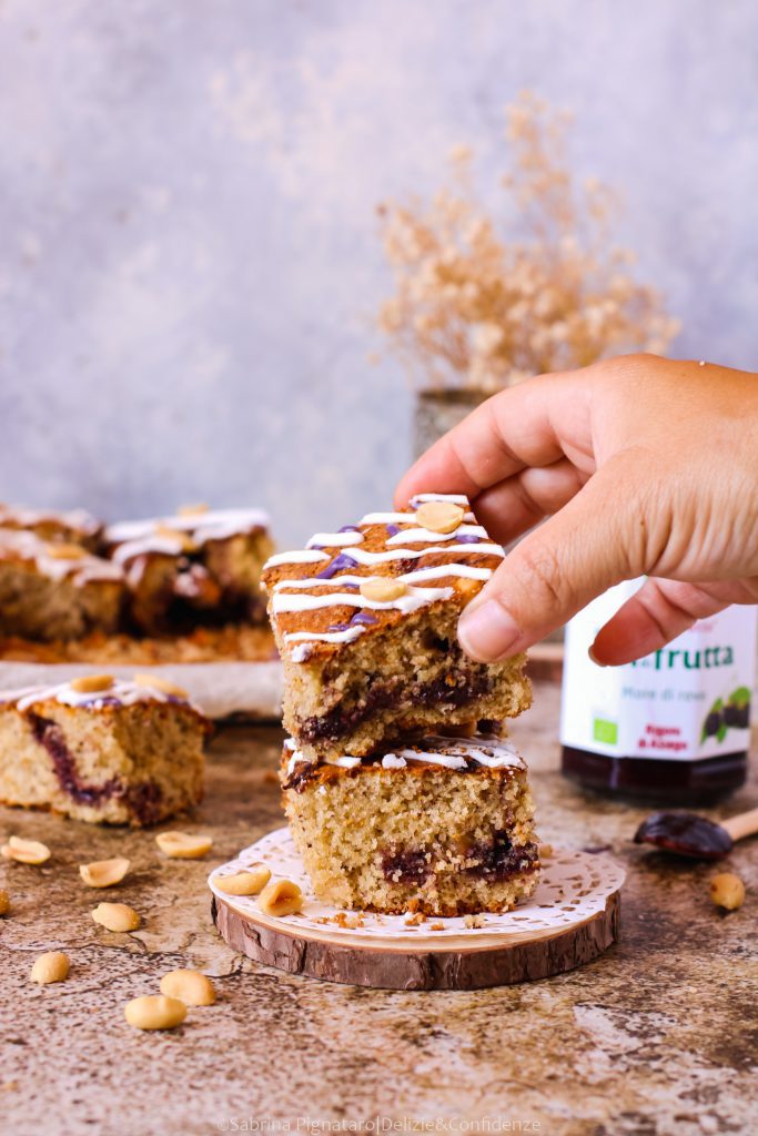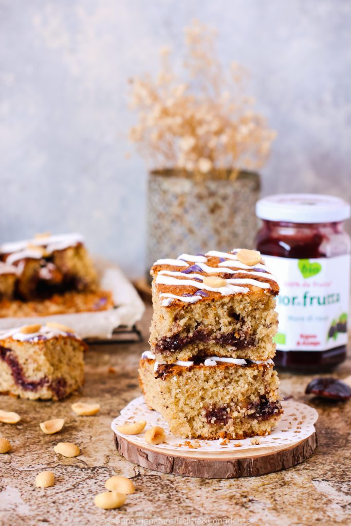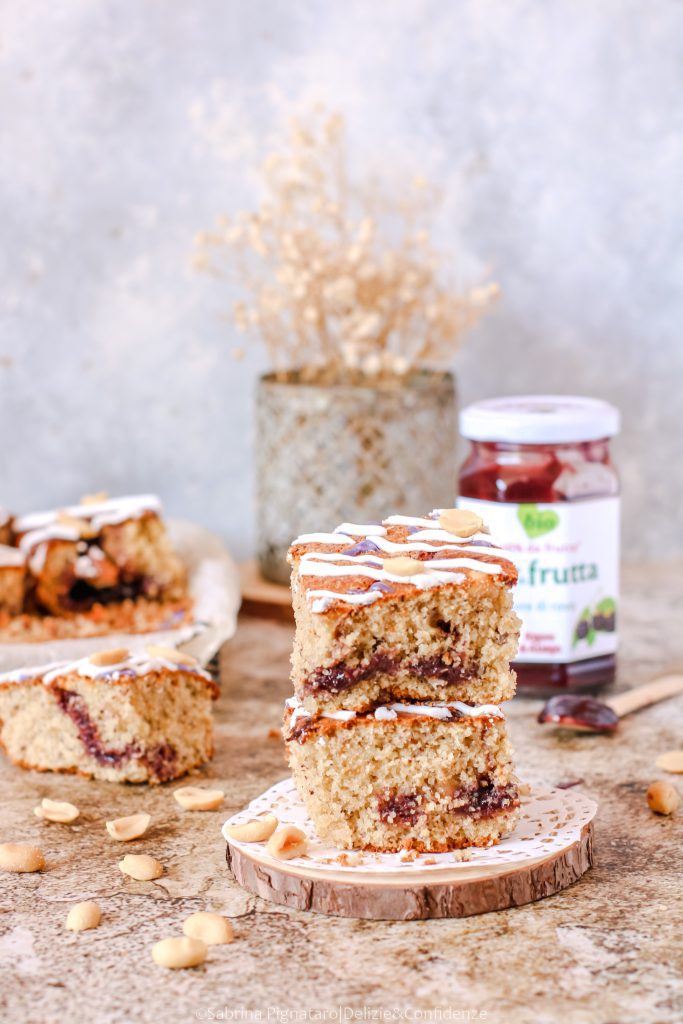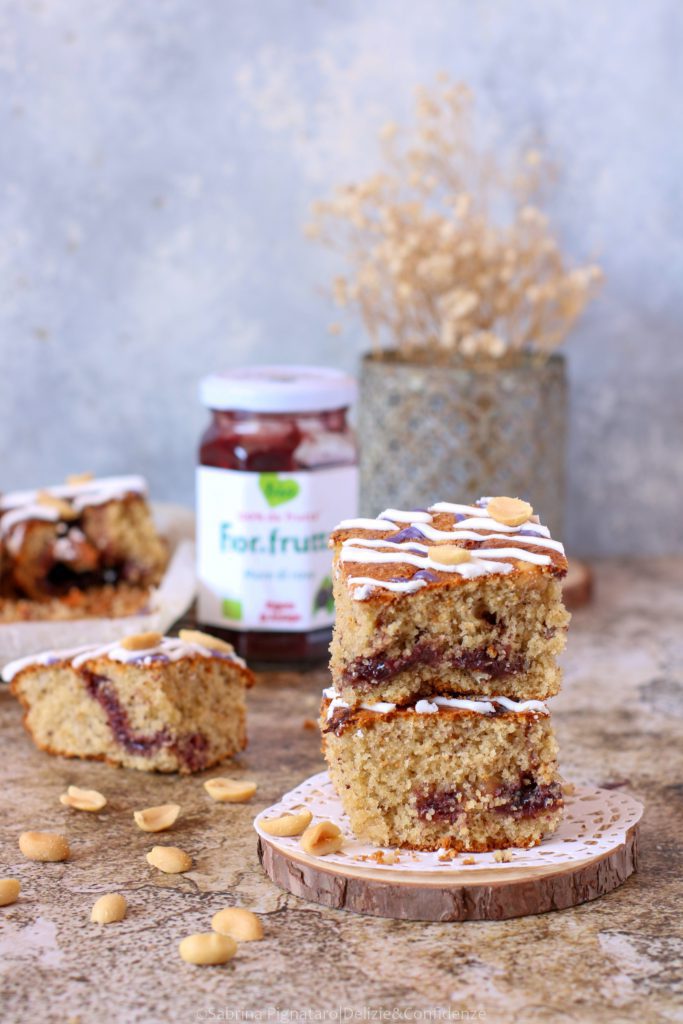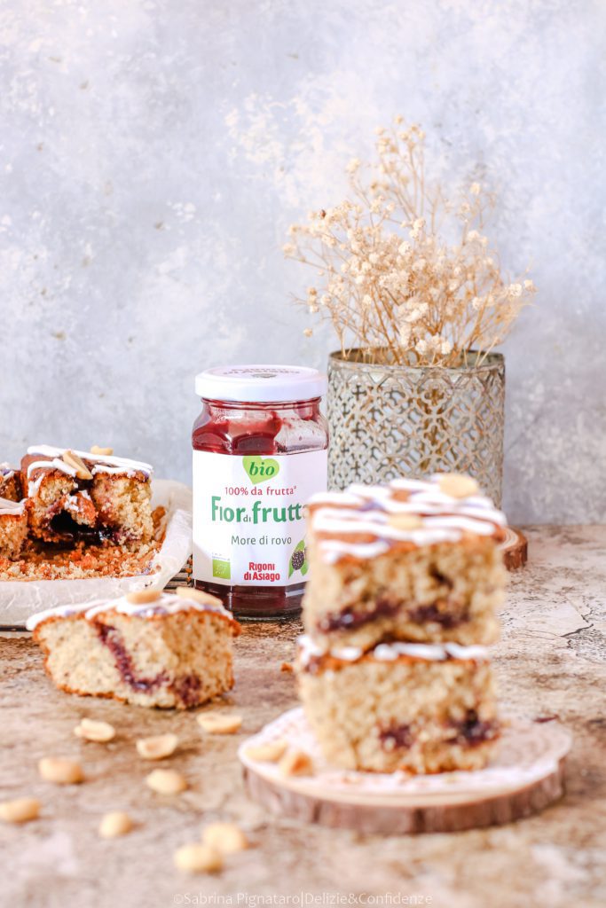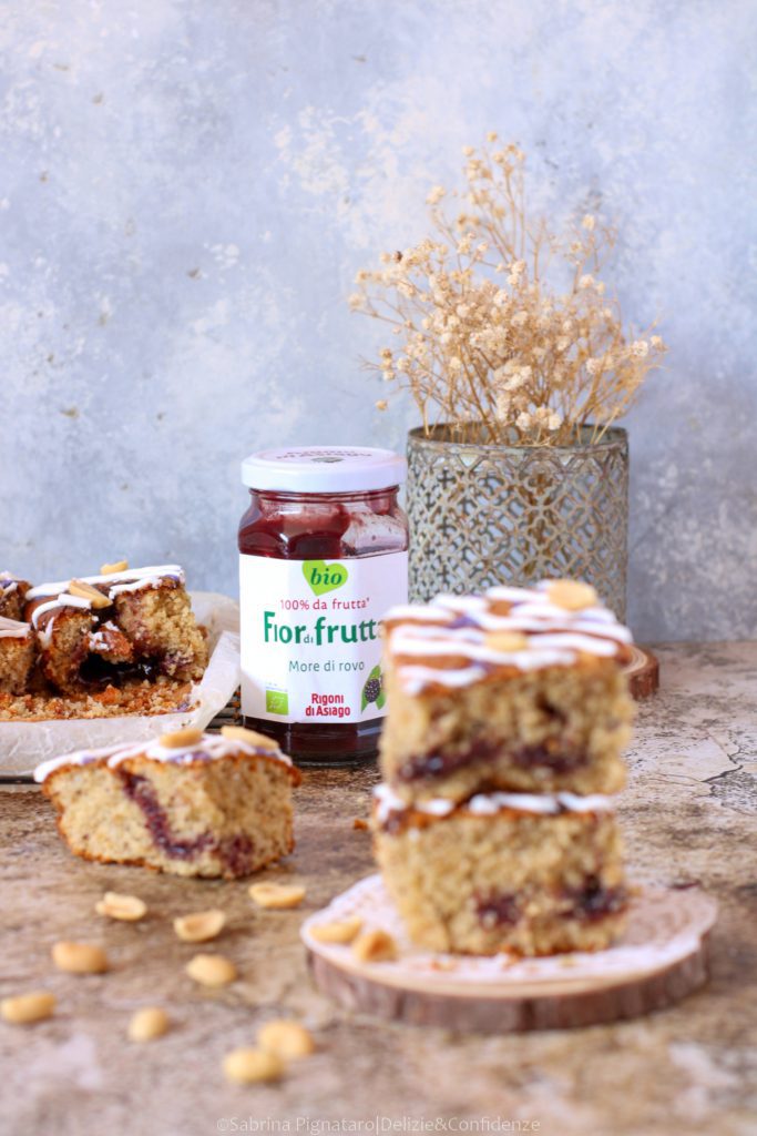 Vai alla ricettaUn soffice e delizioso dolce servito a quadrotti, simili ai blondies per consistenza e bontà, preparare con arachidi, more fresche e confettura di more.