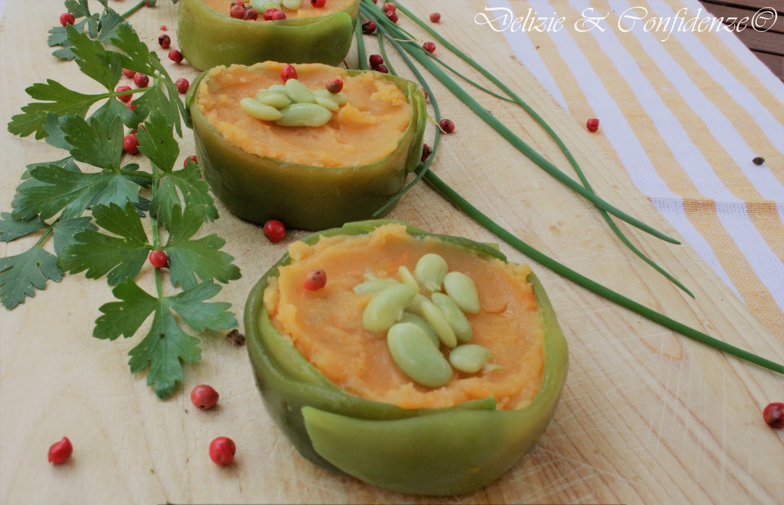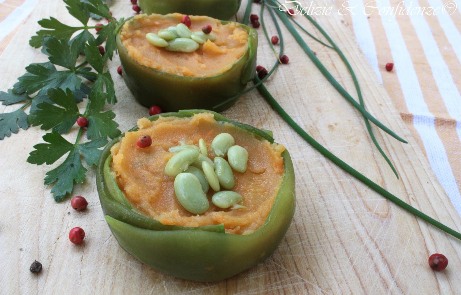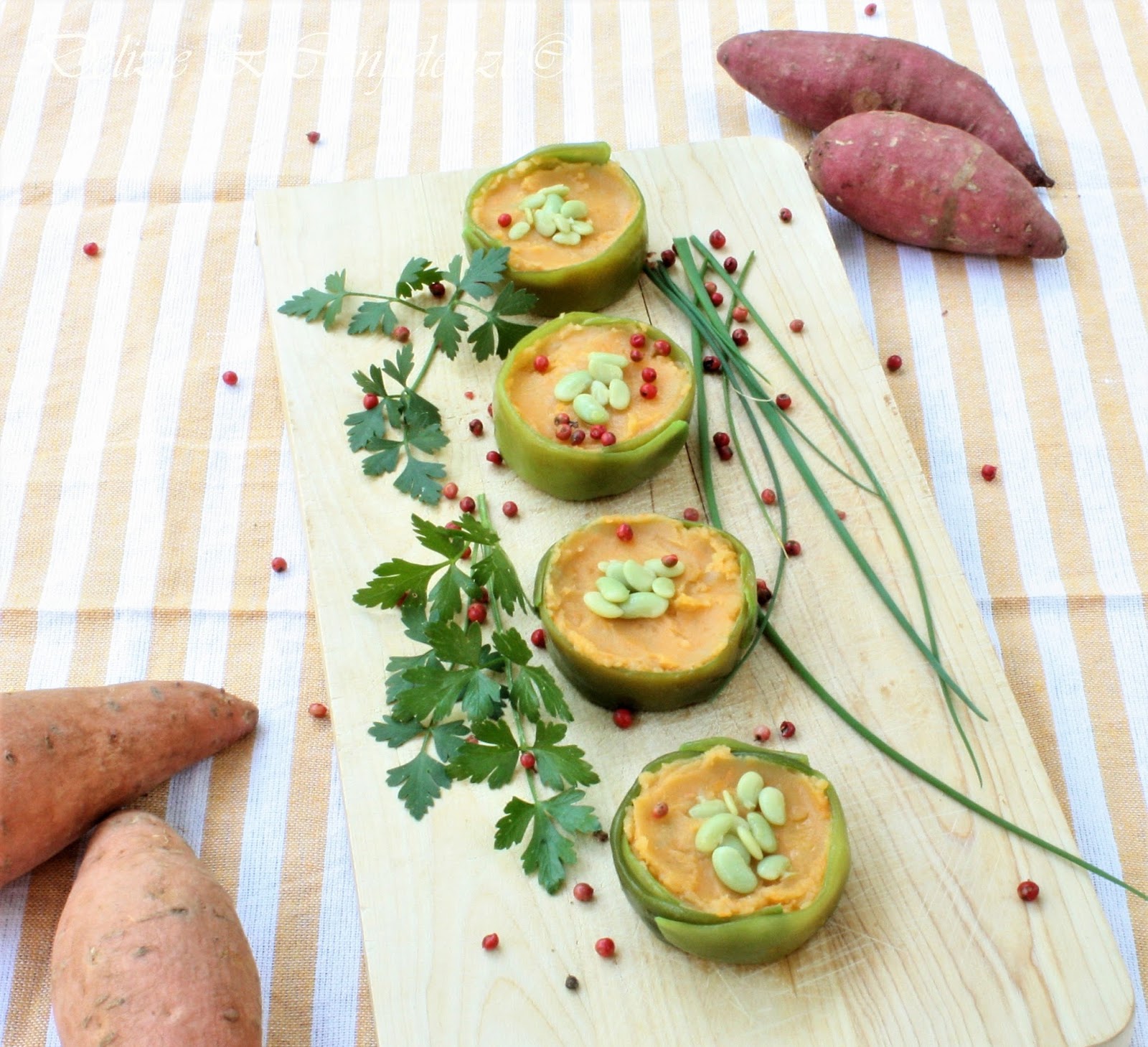 Nel frattempo lavare accuratamente le patate dolci eliminando la buccia, tagliare in pezzi e far cuocere in acqua salata per 15-20 minuti e finché non risultano ben morbide. Scolare e schiacciare con una forchetta aggiungendo, se necessario, un cucchiaino di olio per rendere più morbido il composto. Aggiustare di sale, unire un trito finissimo di prezzemolo fresco, la noce moscata, parte dei semi interni delle taccole lasciati da parte e qualche granello di pepe rosa.