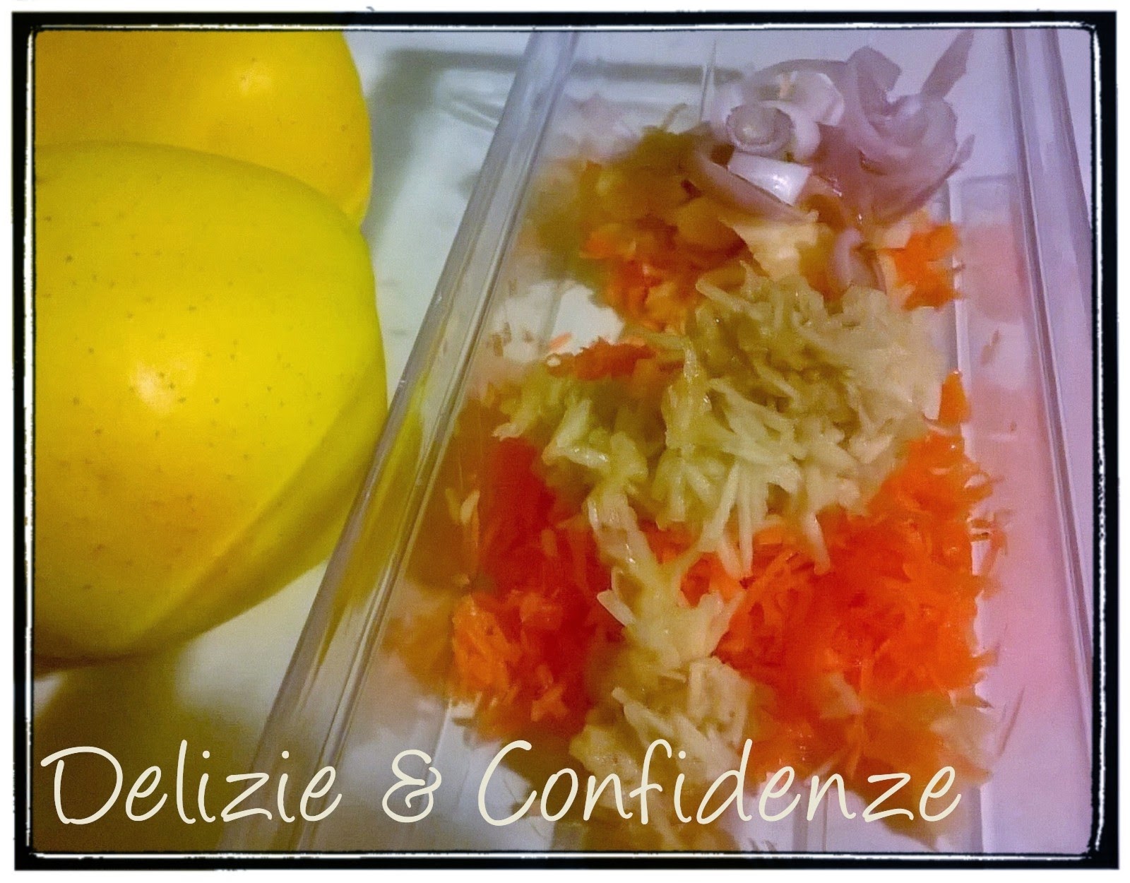 Aggiungere quindi lo scalogno, la mela e la carota grattugiate e lasciar insaporire per qualche minuto.