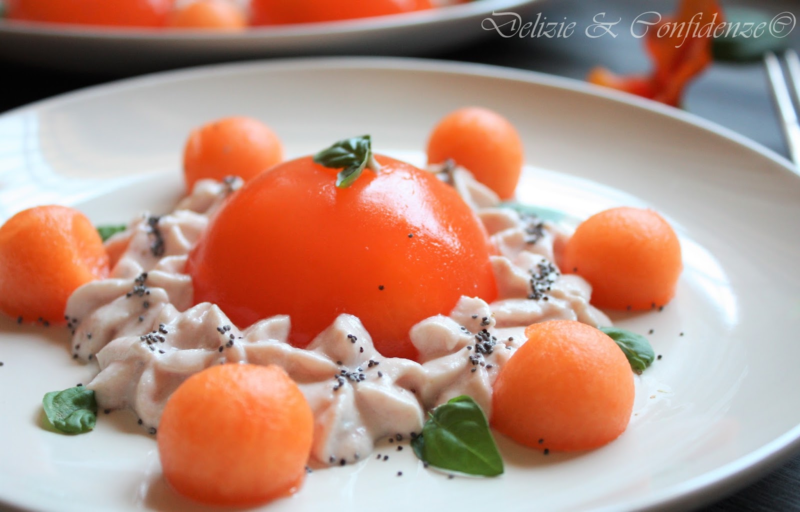 Completare decorando con qualche foglia di basilico, dei semi di papavero e arricchendo il piatto con delle palline di melone ricavate dalla metà di frutto tenuto da parte.