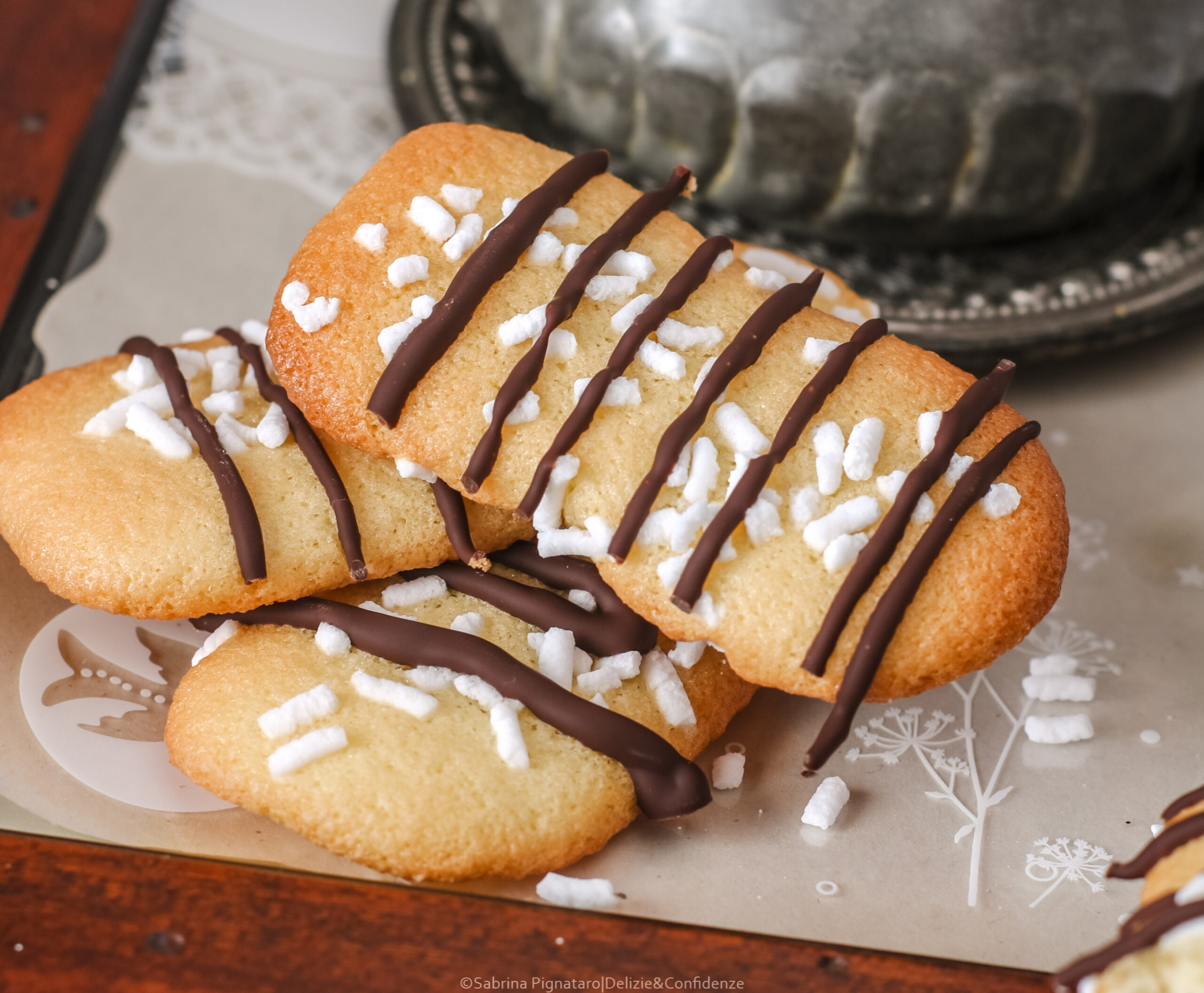 Biscotti Trésor, dei dolcetti a metà tra un biscotto e un pasticcino, friabili e deliziosi., decorati con cioccolato fondente e granella di zucchero.