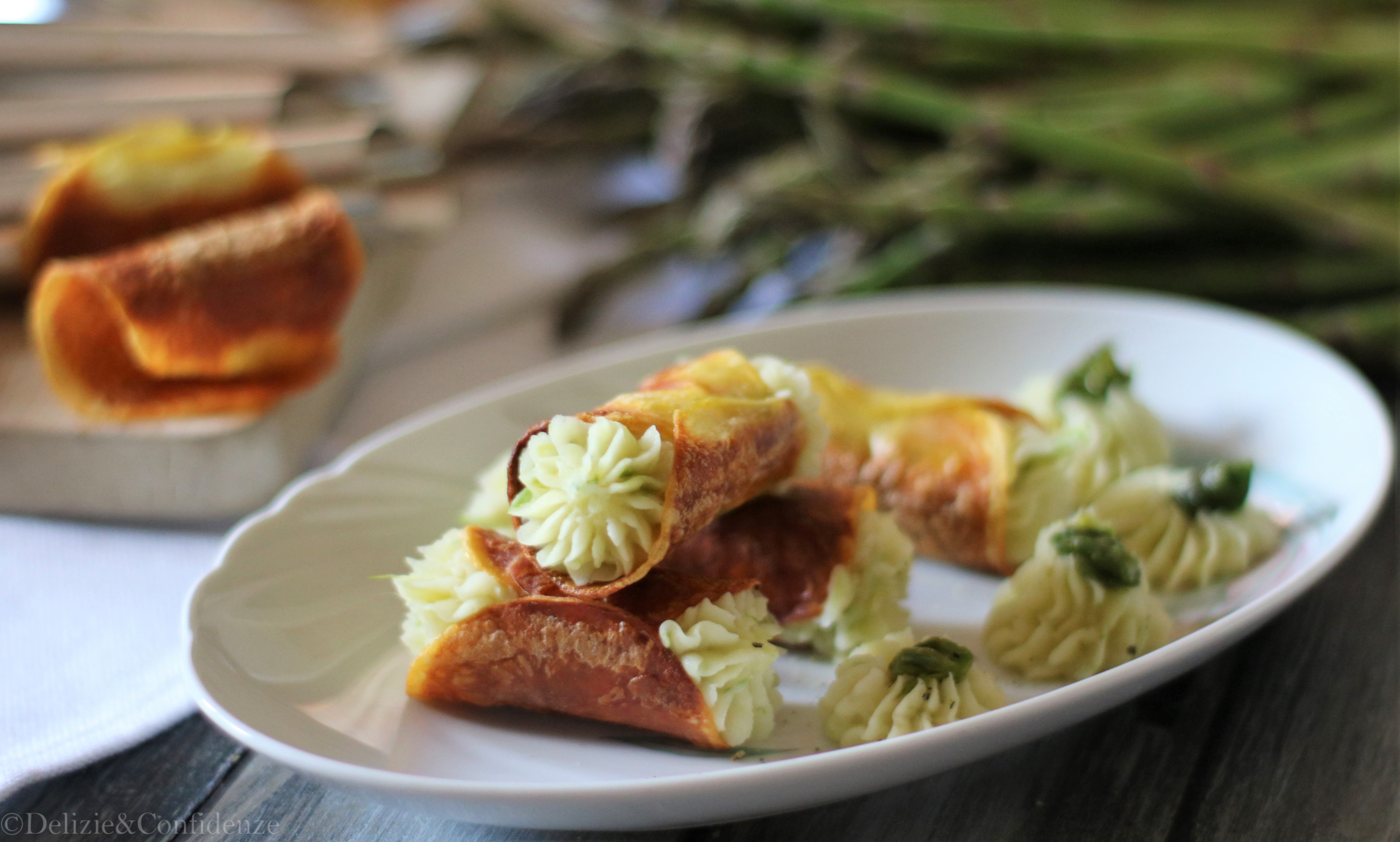 Mini cannoli di cialda di patata croccante che accoglie una deliziosa crema di patate, “formaggio” vegetale e asparagi. Sfiziosi come antipasto o aperitivo.