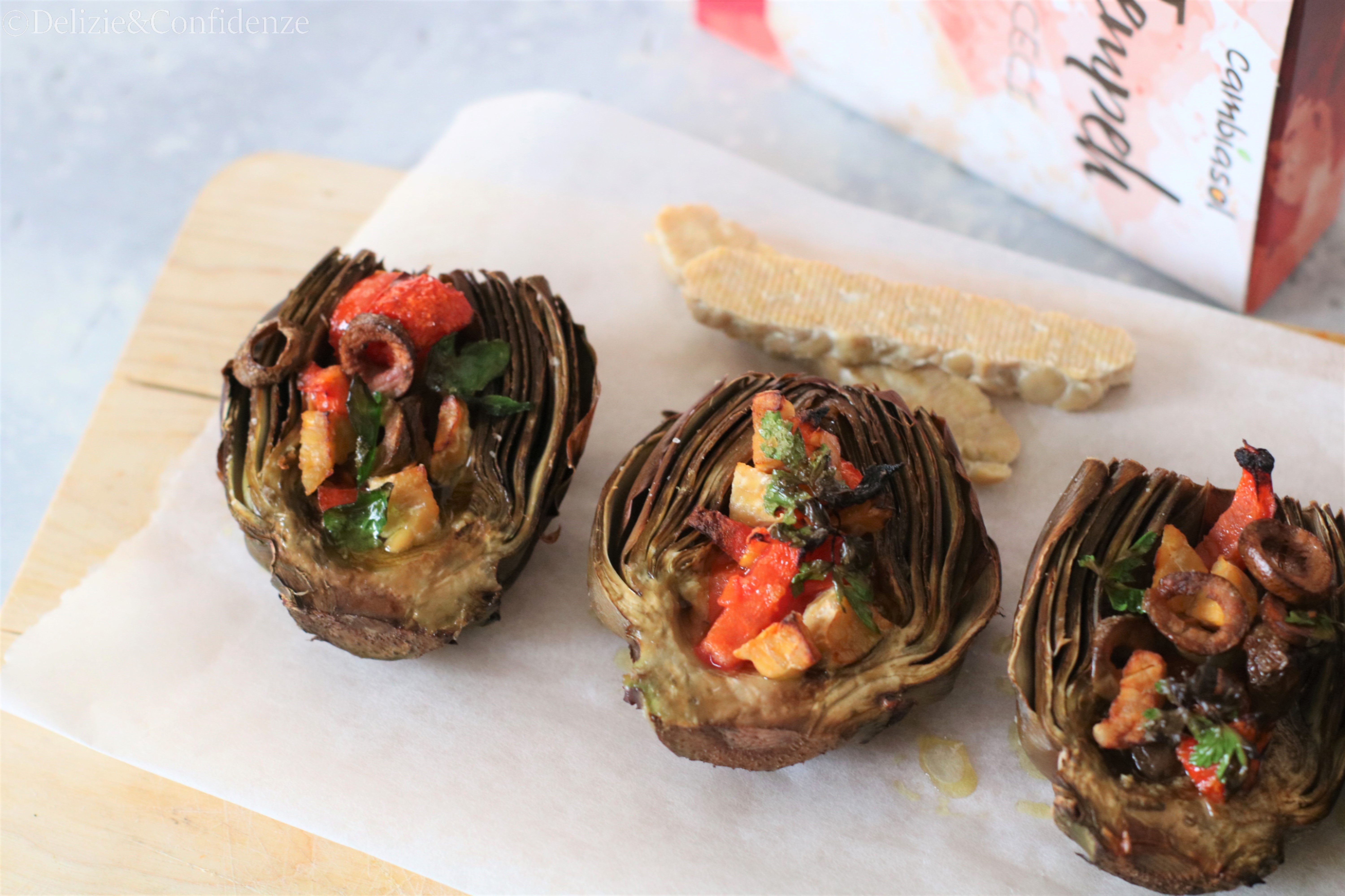 Carciofi ripieni con tempeh di ceci, olive e pomodori