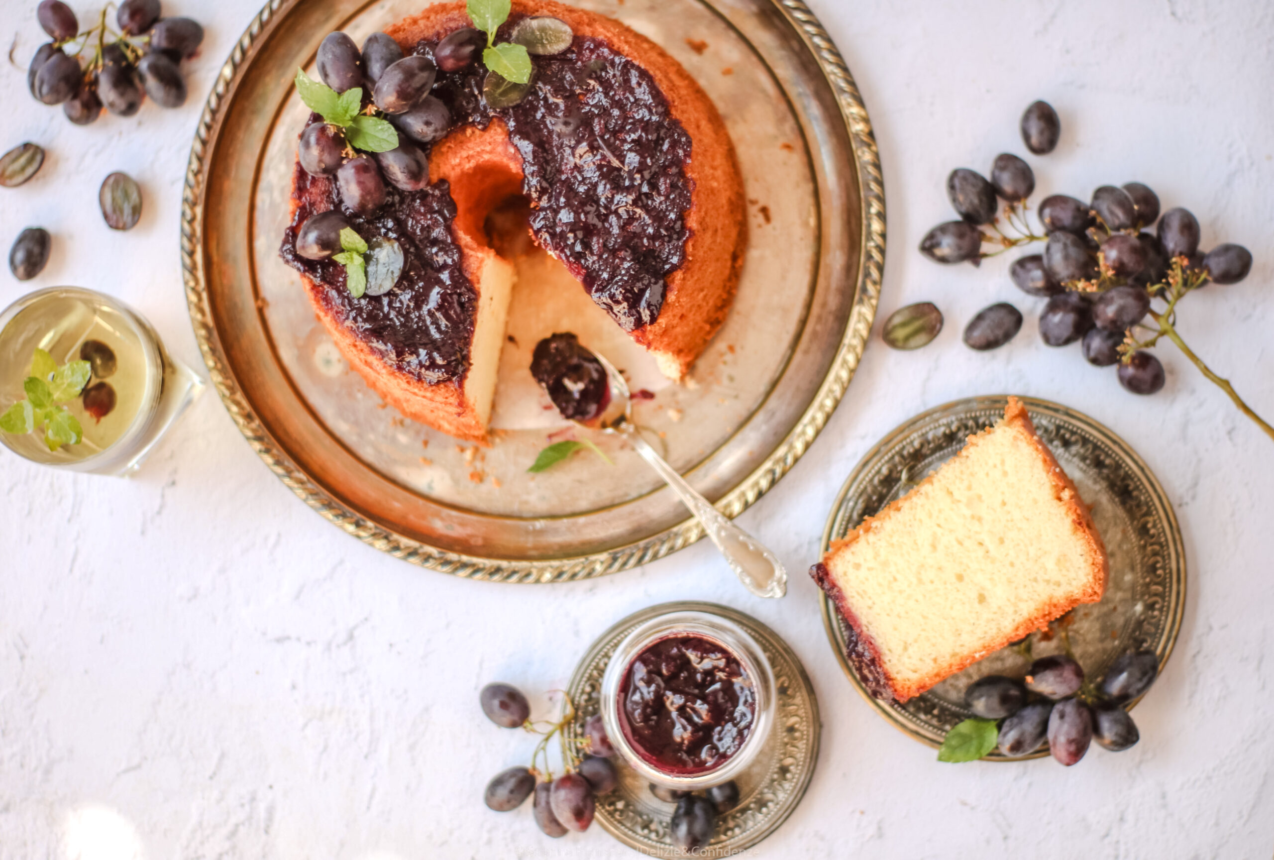 Chiffon cake al Frascati, soffice e profumata, accompagnata da una golosa riduzione di uva pizzutella per un abbinamento elegante e raffinato.