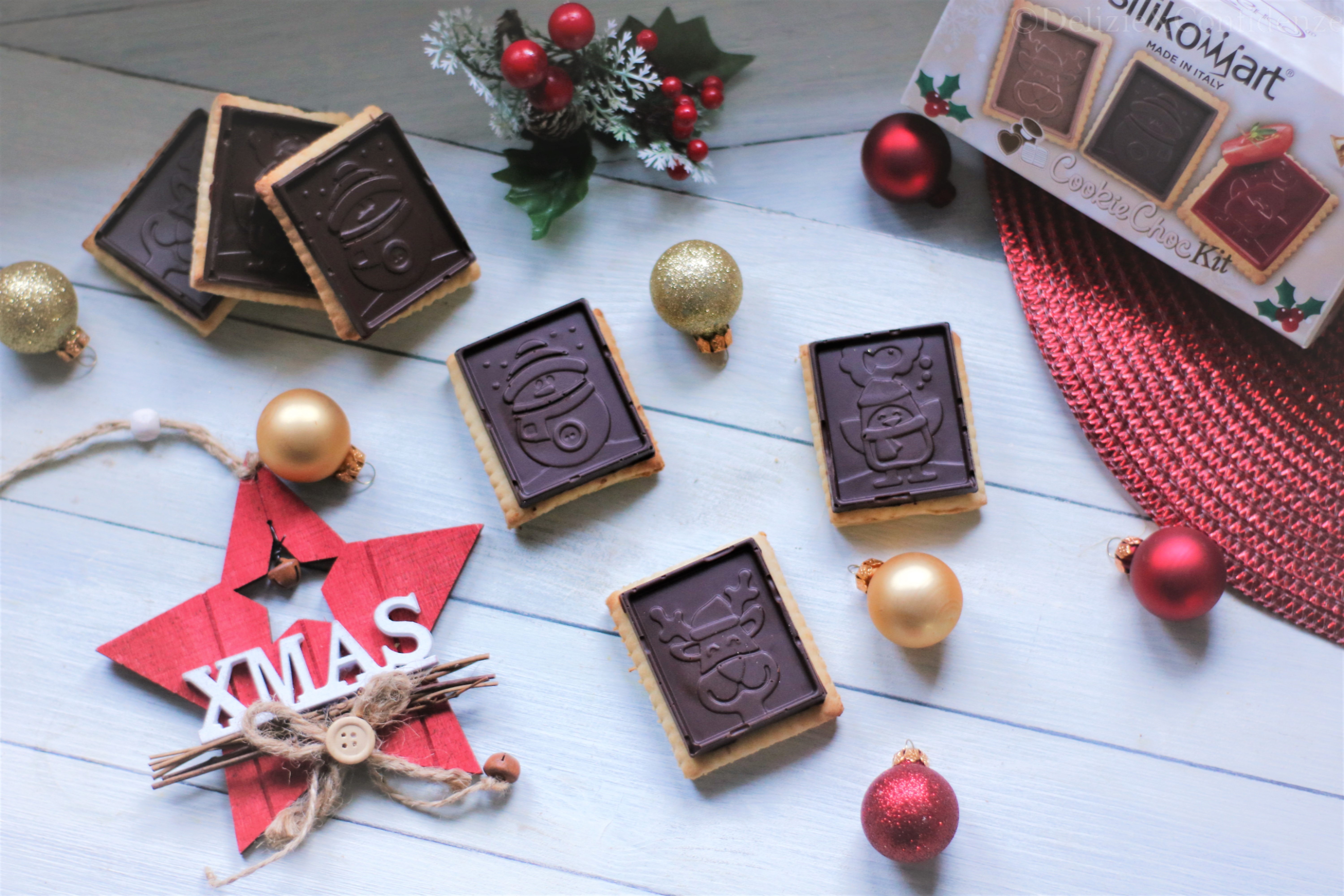 Deliziosi biscotti di frolla al miele, senza burro e  senza uova, con una croccante placca di cioccolato fondente dai simpatici decori natalizi.