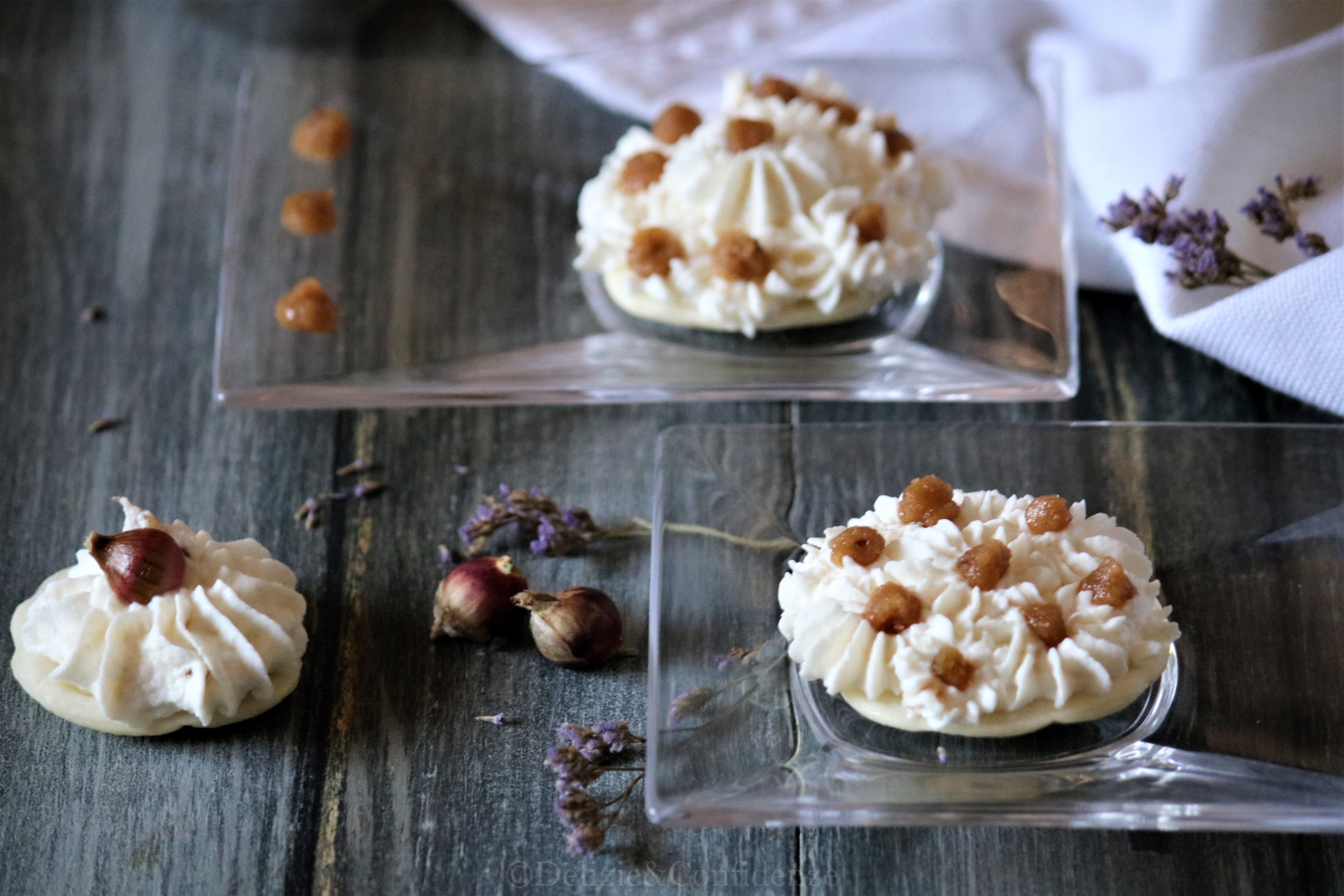 Cialde di meringa al formaggio con crema di ricotta e perle di cipolla egiziana caramellate