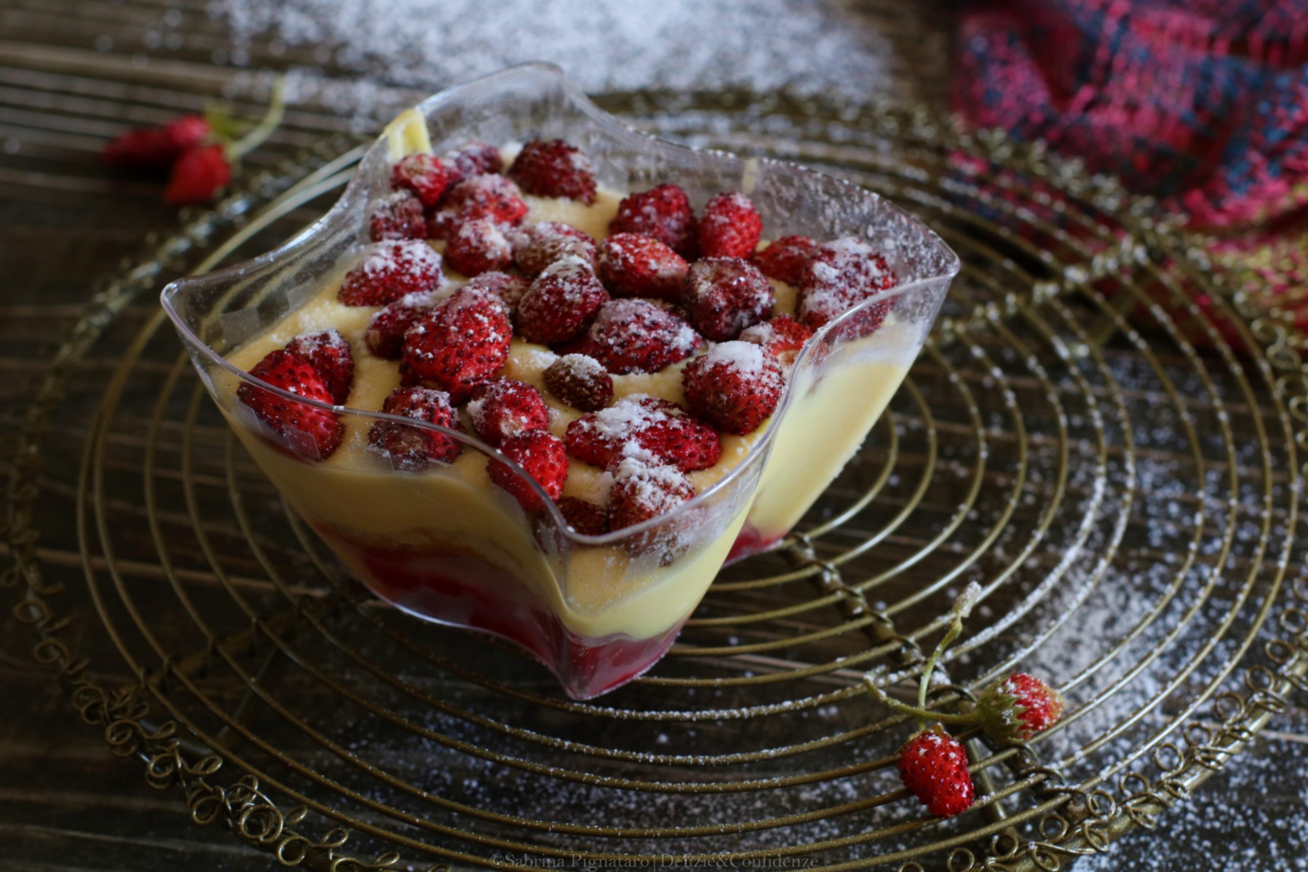 La crema alle mandorle e fragoline di bosco è un dessert fresco e delicato, da servire in coppette monoporzioni, con una base di pasta bisquit, senza glutine e senza latticini.