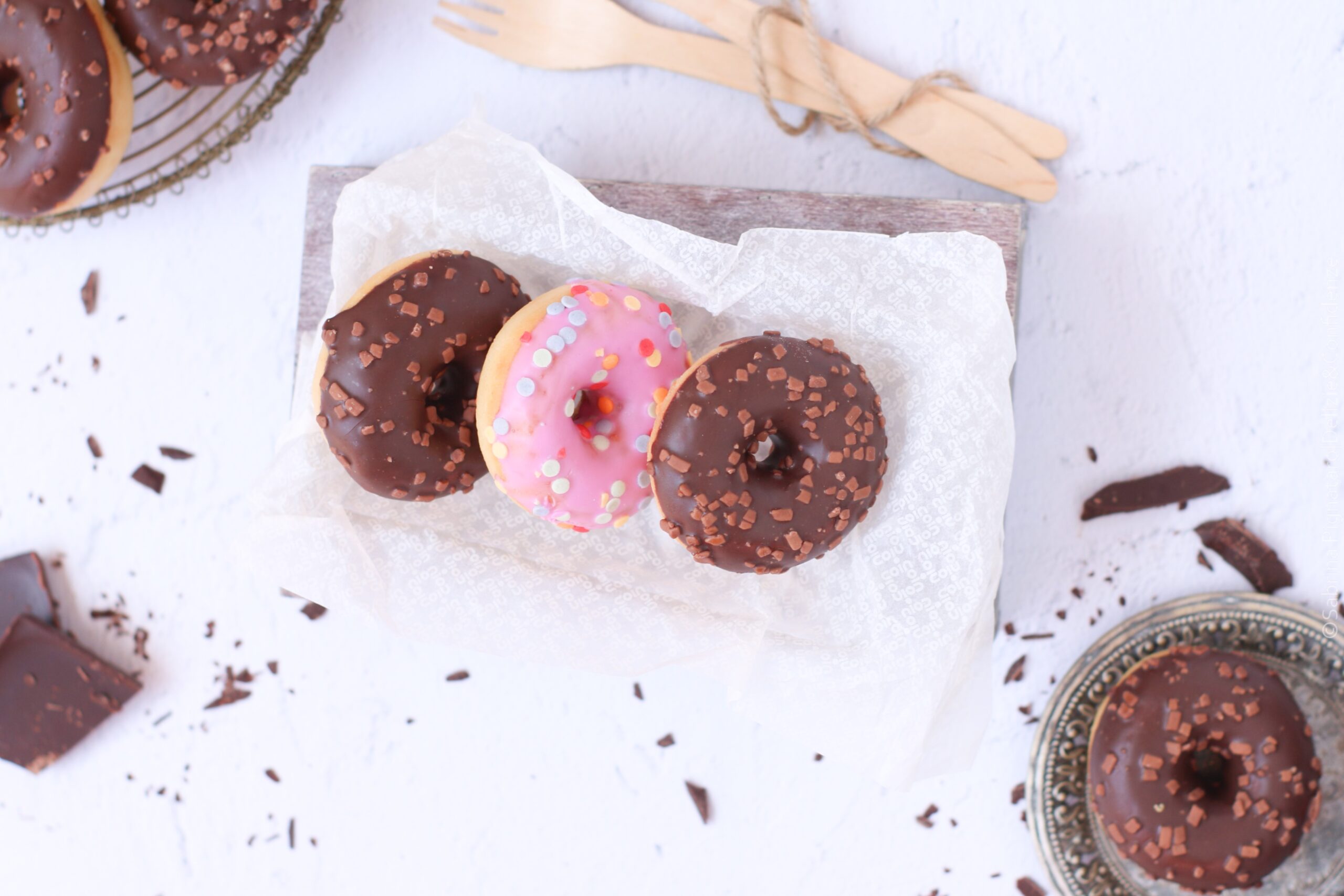 le ciambelle fritte americane ricoperte con glassa colorata, cioccolato e confettini, in questa mia rivisitazione senza proteine del latte.