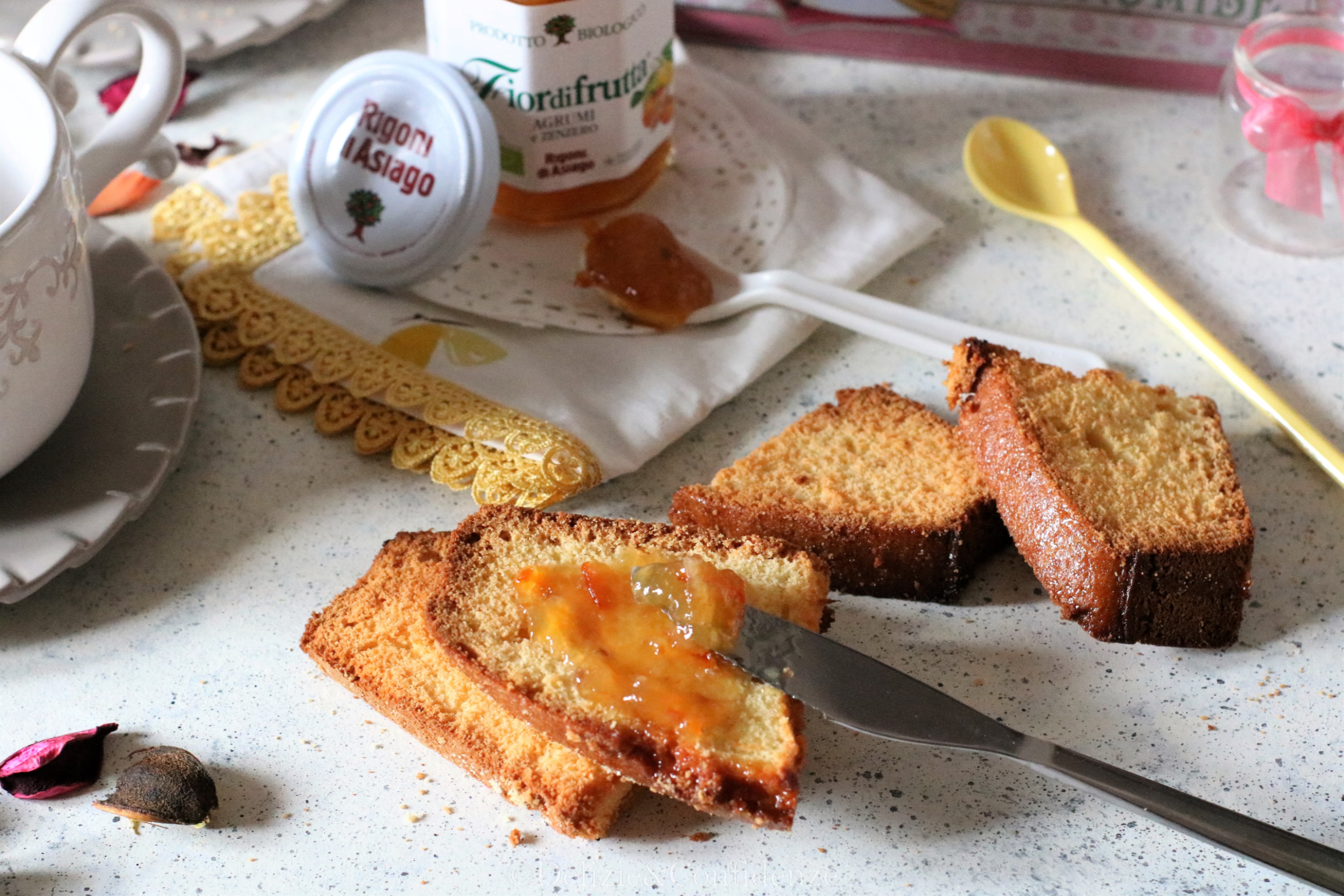 Fette biscotatte glassate di ciambellone all’arancia. Una dleiziosa idea del riclico per tostare e glassare le fette del dolce con una glassa alla confettura.