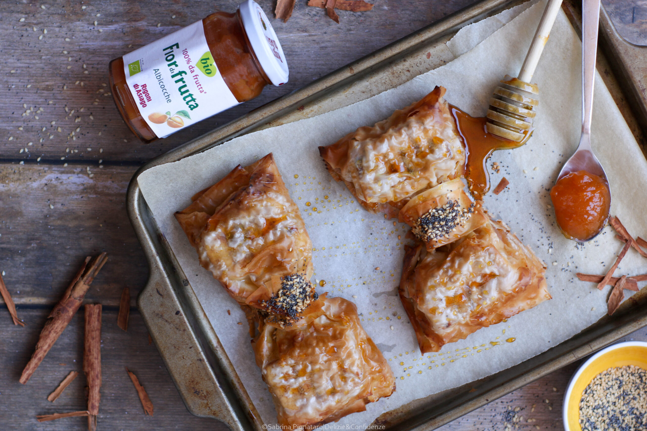 Fiocchi di pasta fillo con tofu e Fiordifrutta albicocche, semplici, leggeri e raffinati. Dal gusto agrodolce, regalano croccantezza e morbidezza.