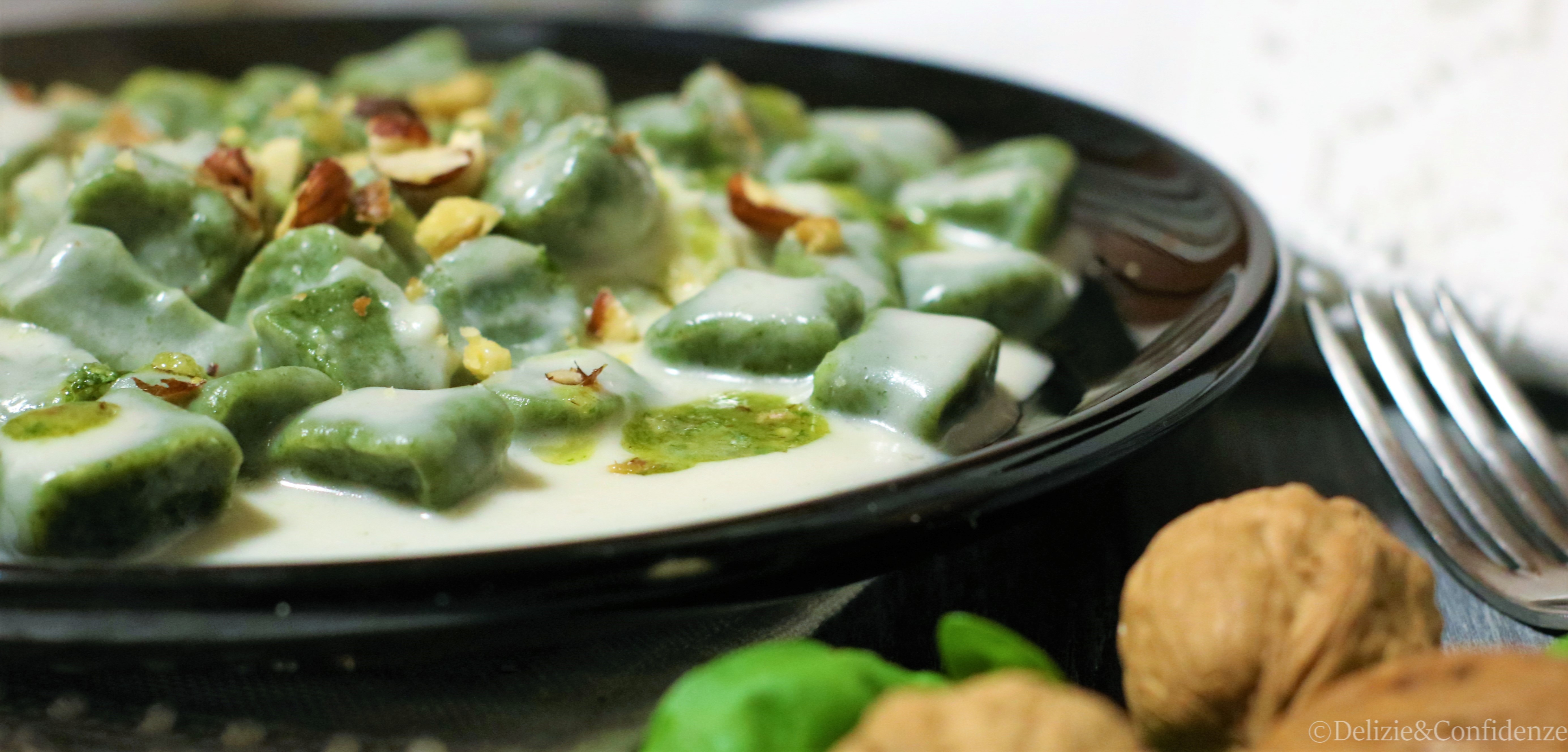 Gnocchi di borragine con fonduta di mozzarella, gocce di basilico e granella di noci e nocciole