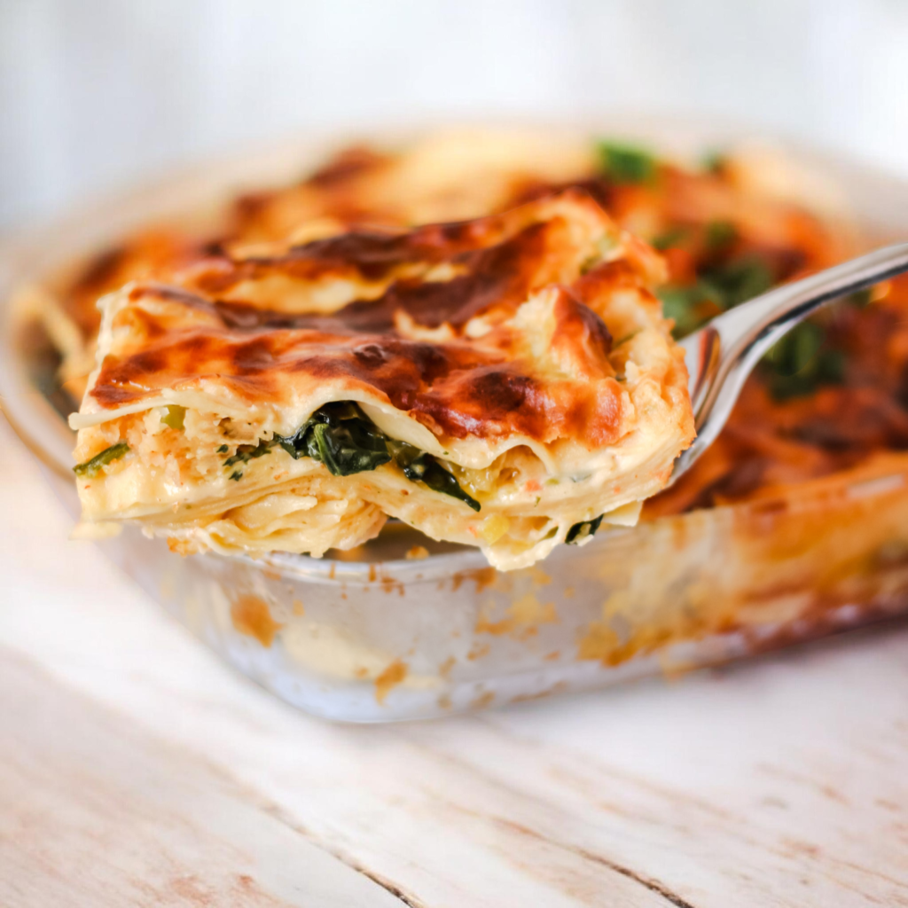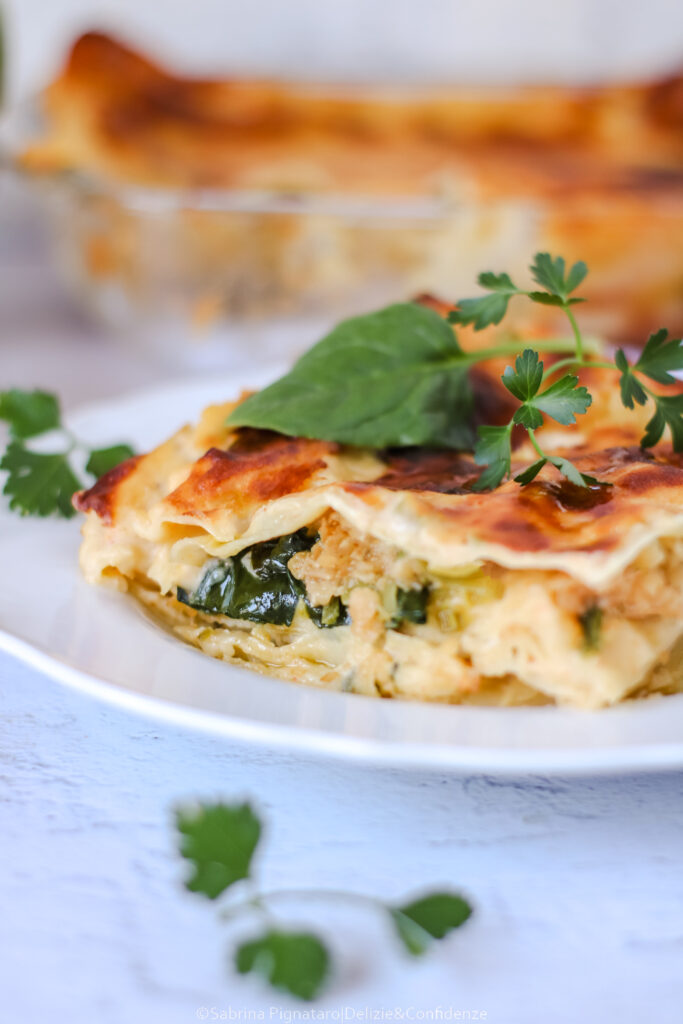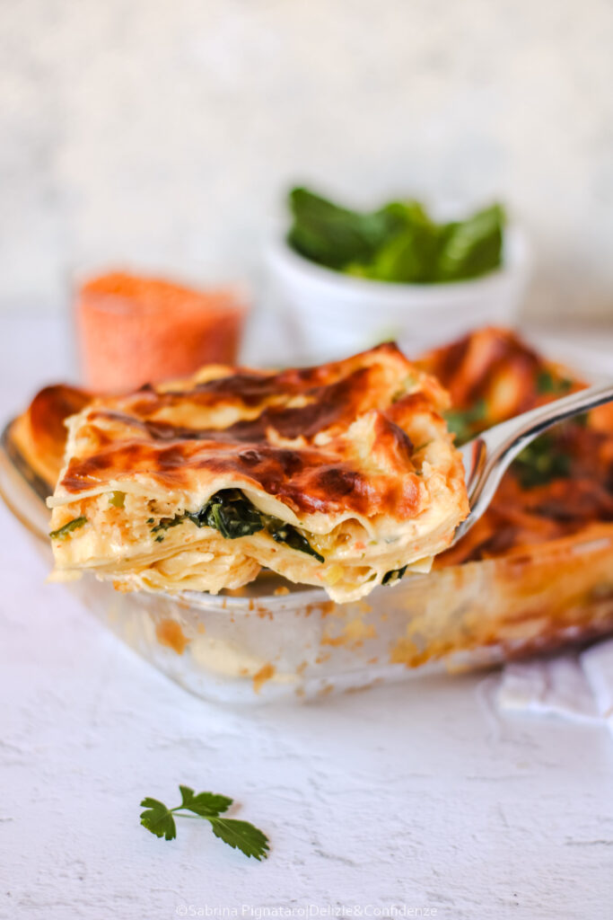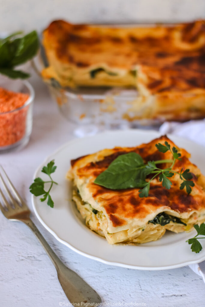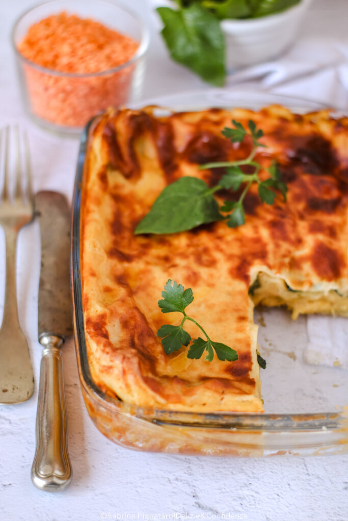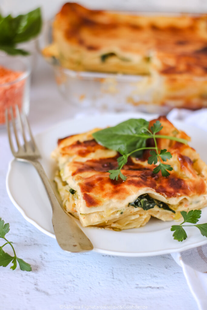 Gli strati di pasta fresca si alternano a un ragù delicato di lenticchie rosse e spinaci, arricchito da una besciamella vegetale morbida e vellutata che lega tutti gli ingredienti. Il risultato è un primo piatto equilibrato, cremoso ma non pesante, capace di valorizzare i sapori semplici delle verdure primaverili.