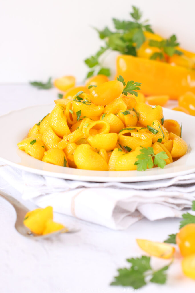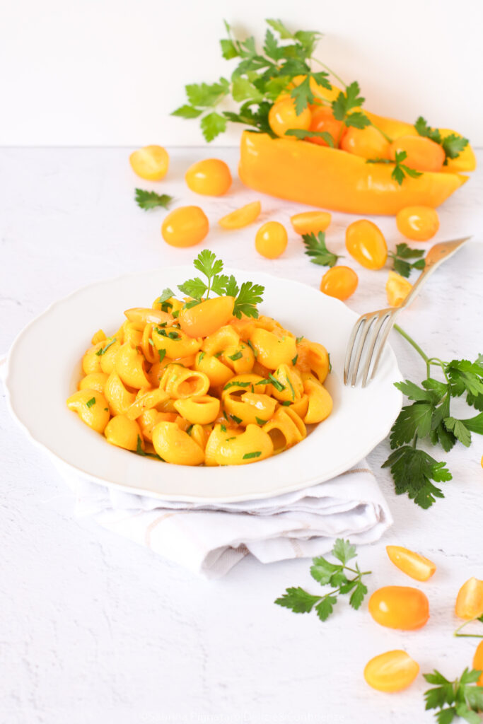 Pasta con crema di Peperoni, Datterini Gialli e Zafferano