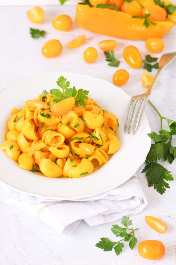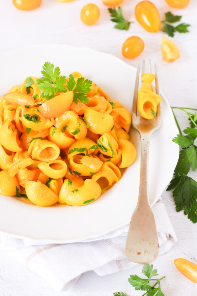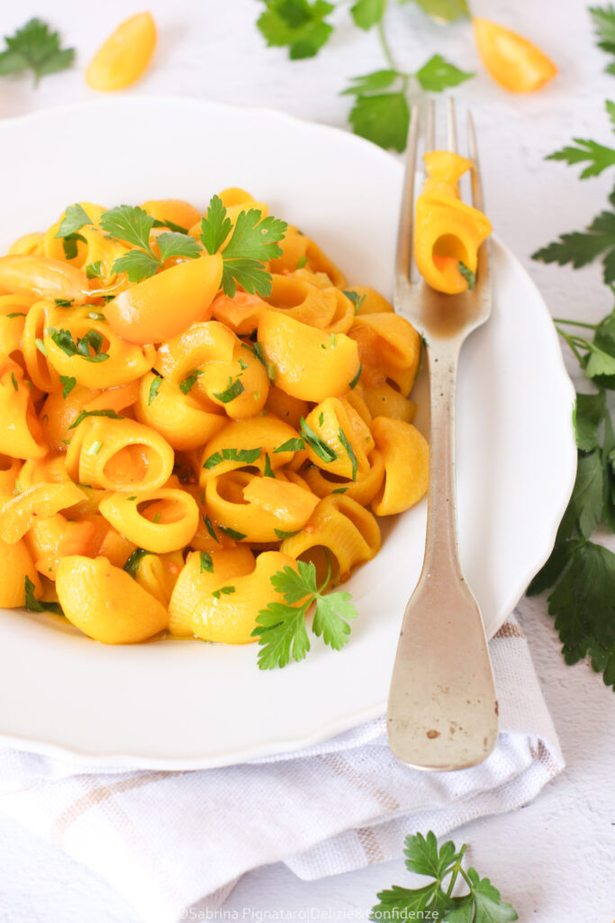 Le lumachine in giallo sono un primo piatto preparato con pomodorini, peperone e zafferano, una pasta cremosa, colorata e ricca di gusto. Facile da preparare, perfetta per stupire a tavola!