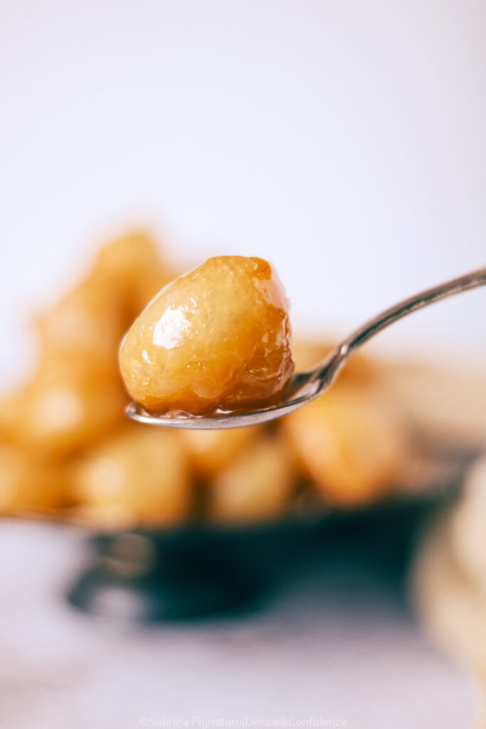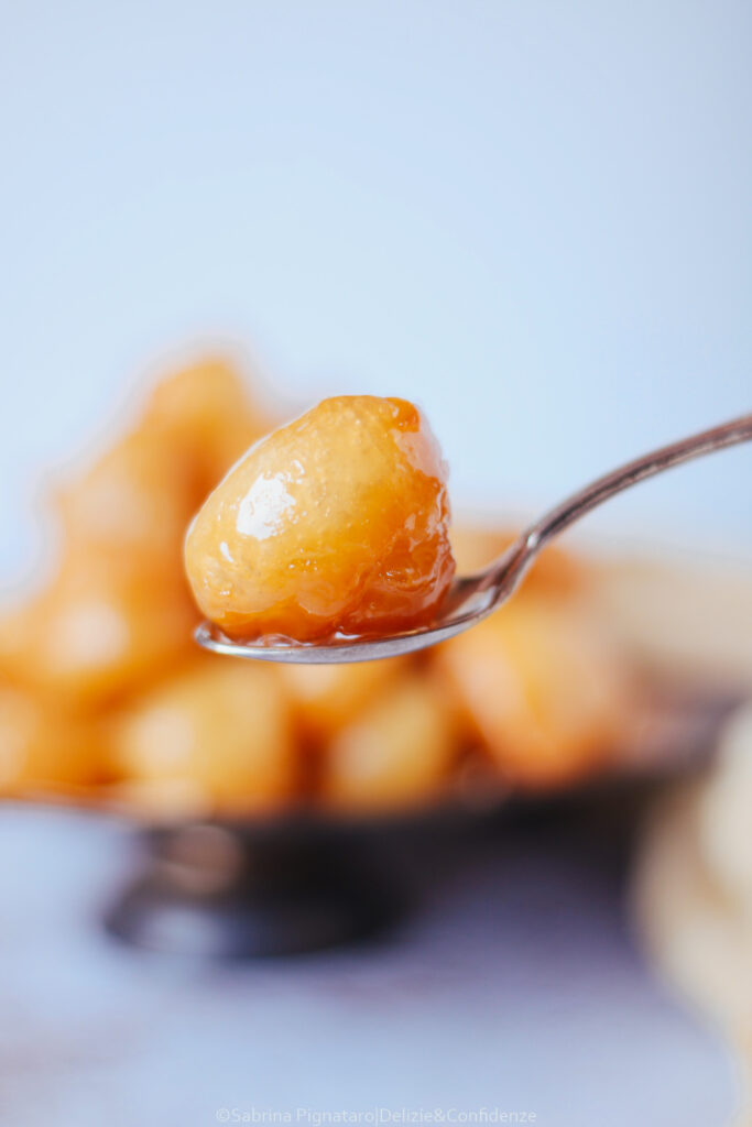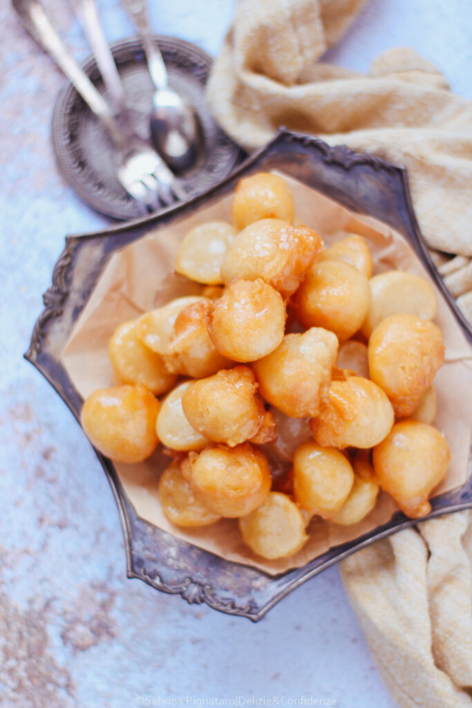 La forma si ottiene allo stesso modo: lasciando cadere piccole quantità di impasto nell’olio bollente, aiutandosi con due cucchiaini oppure con un metodo pratico e casalingo, versando l’impasto in un sacchetto alimentare con chiusura a zip e tagliandone un angolo, come una sorta di sac à poche improvvisato.