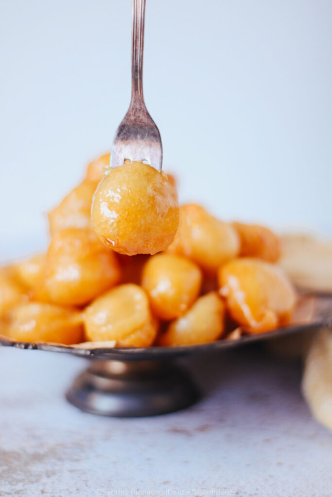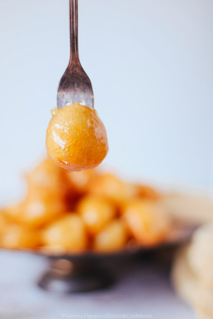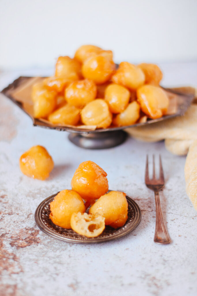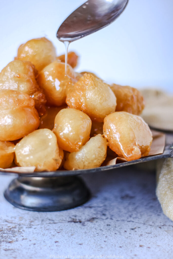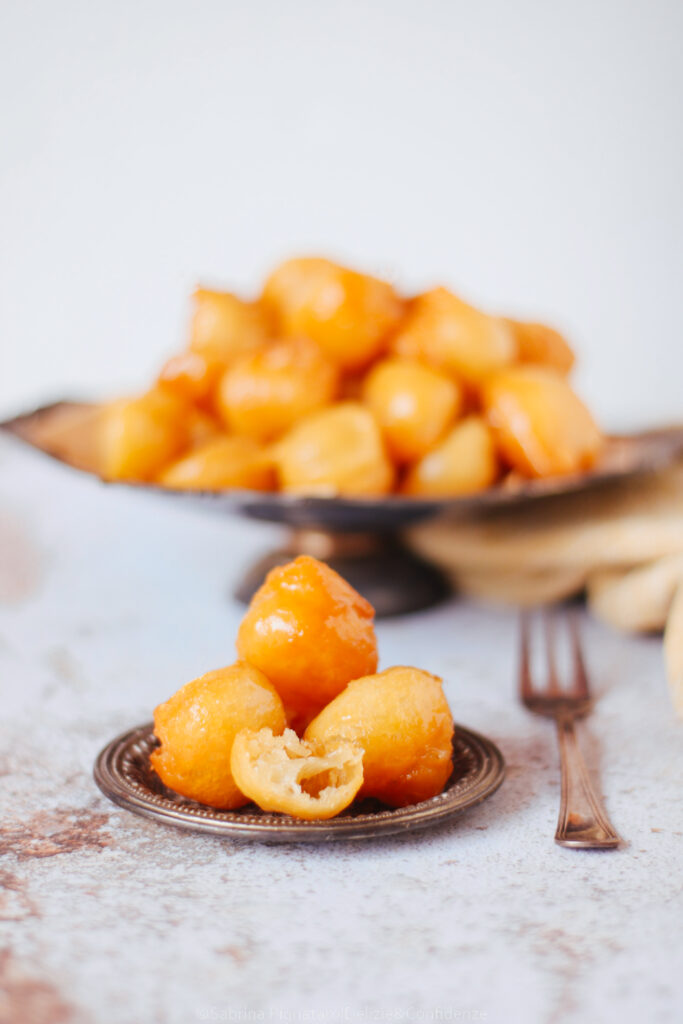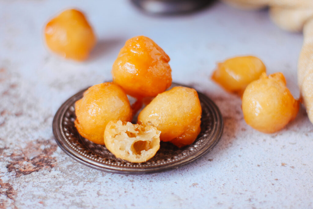 C’è qualcosa nei luqaimat che, al primo sguardo (e soprattutto al primo morso) mi ha fatto sentire a casa. Per me, è impossibile non pensare alle mie castagnole di Carnevale: piccole, tonde (o quasi), dorate, nate anch’esse da un gesto semplice e antico come quello di lasciar cadere un po’ di impasto nell’olio caldo. L’impasto dei luqaimat ricorda molto quello delle castagnole “molli”, una pastella fluida ma non liquida, simile a quella dei pancake, leggermente più densa, che prende forma proprio durante la frittura. A cambiare è il tipo di lievitazione: mentre nelle castagnole si utilizza solitamente il lievito in polvere per dolci, nei luqaimat si ricorre al lievito di birra in polvere (istantaneo), che dona una struttura più alveolata e una leggerezza diversa all’impasto.