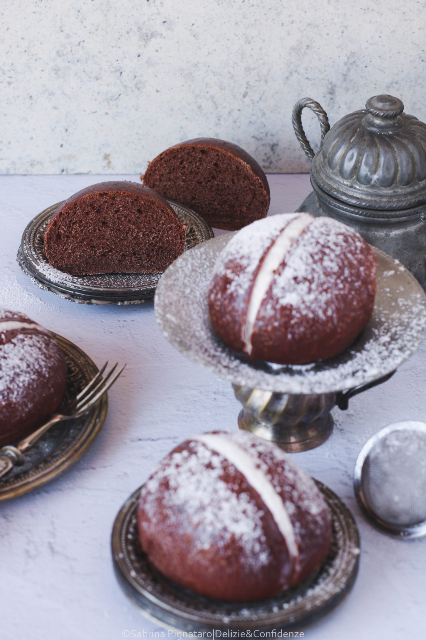 Maritozzi al cacao in formato mini, la rivisitazione della classica ricetta del dolce tradizionale della pasticceria romana e del Lazio in generale. Ricetta senza lattosio nè proteine del latte.