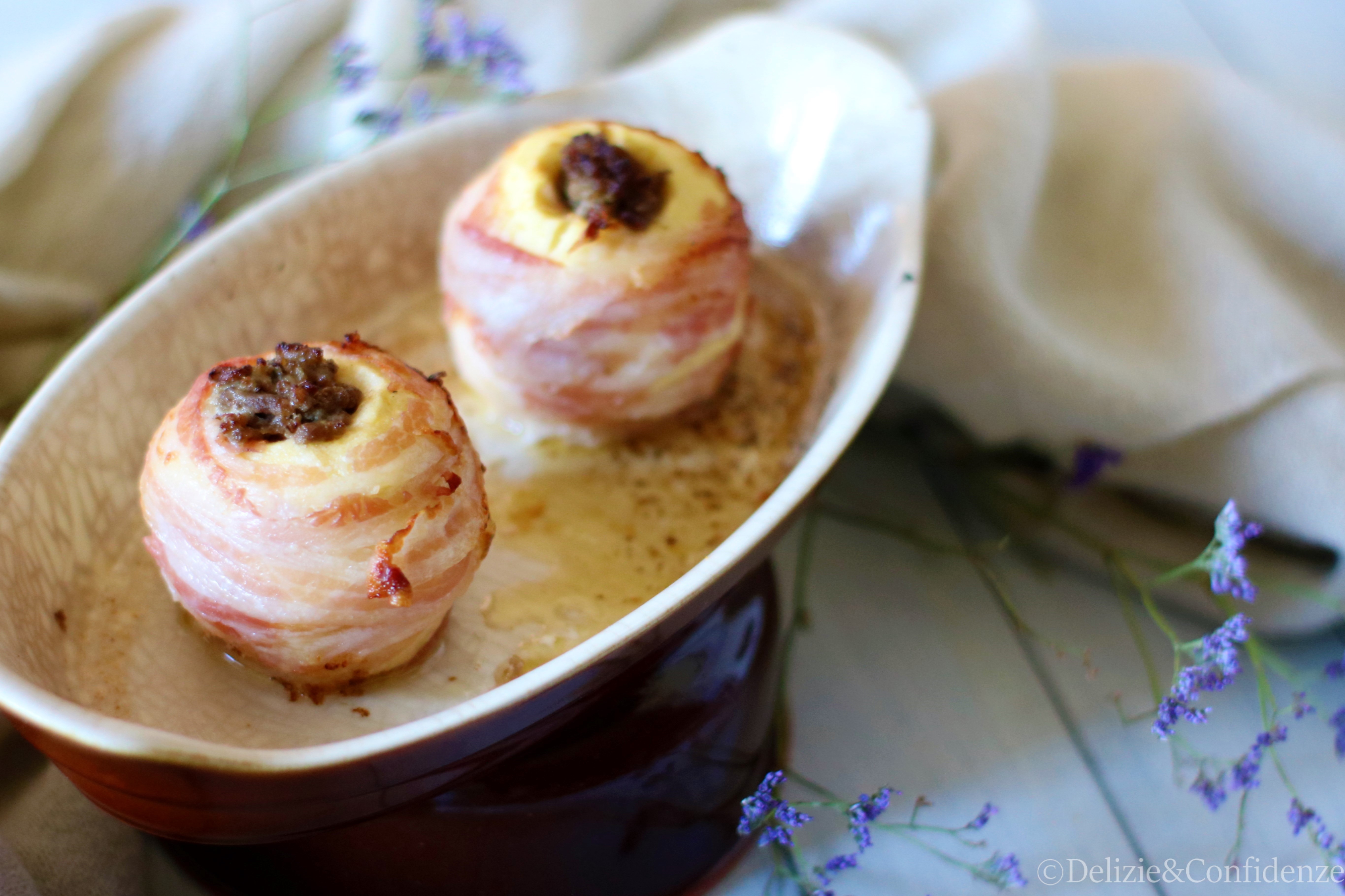 Le mele ripiene di carne e avvolte in pancetta croccante sono un piatto caldo e ricco, ideale per i menù invernali quale questa nuova proposta della Rubrica Idea Menù.