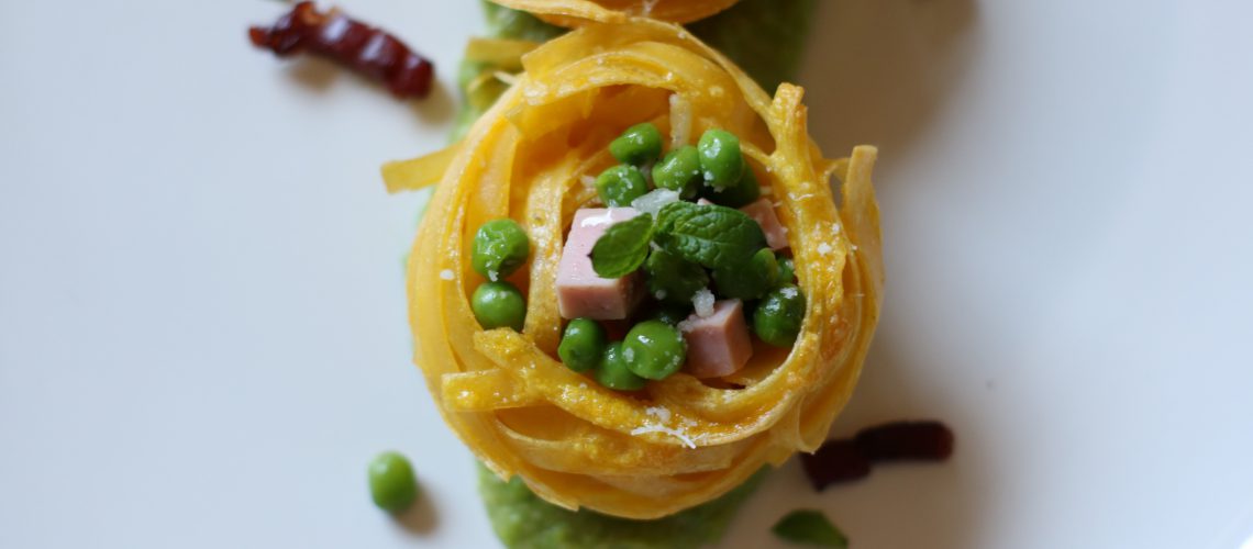 Da un grande classico della cucina italiana, la mia reinterpretazione del tradizionale piatto romano di “fettuccine alla papalina”. Il primo piatto della cucina laziale diventa così un piatto da aperitivo, perfetto per un buffet all’aperto, o ancora come antipasto in un galà o un evento speciale.