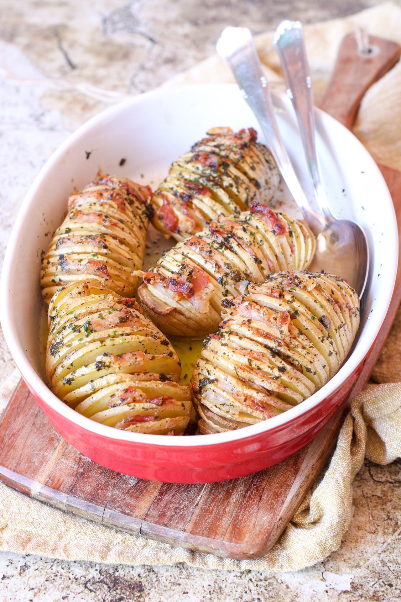 Le patate ‘mbuttunate sono un secondo piatto scenografico ricco di gusto e semplice da preparare. Si tratta di patate “a fisarmonica” o “patate hasselback” , tagliate quindi a fette molto sottili e riempite in ogni fetta: da qui il termine ‘mbuttunate ossia imbottite (farcite, riepiene).