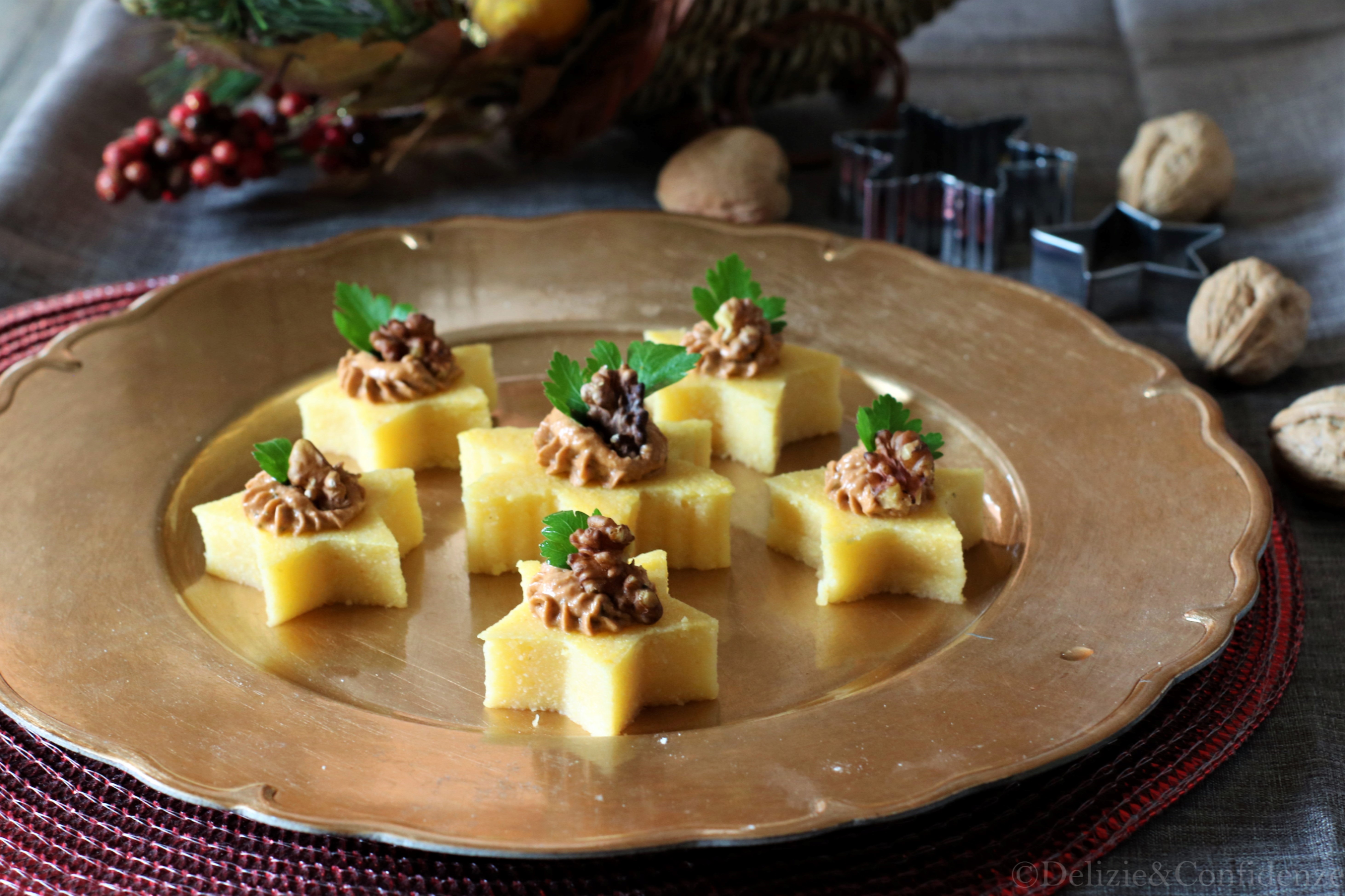 Le polentine sono delle graziose stelline di polenta, servite con una gustosa crema di ricotta, pomodori secchi e noci. Semplice e veloce da preparare, sono ideali da servire come antipasto nei giorni di festa.