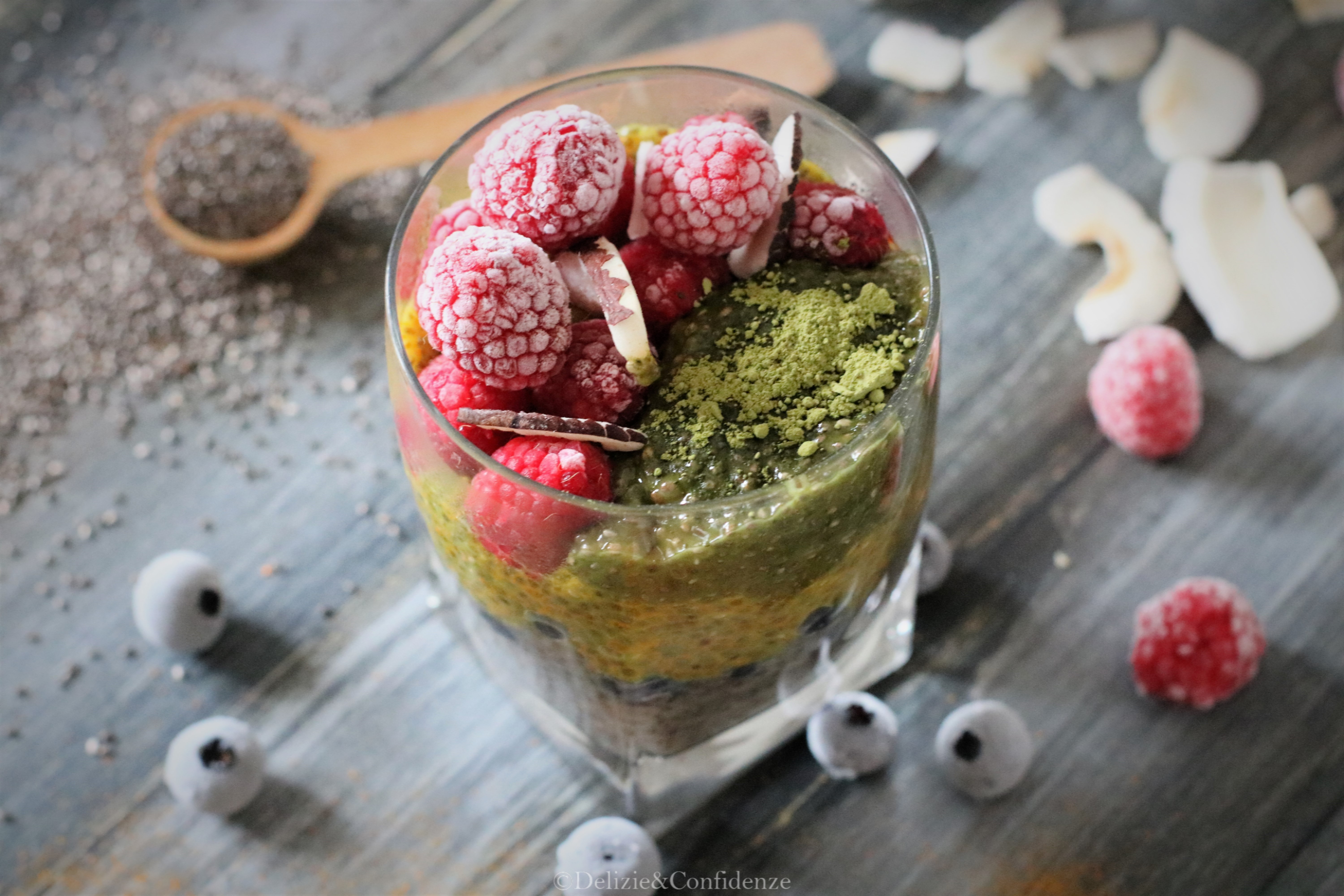 Pudding ai semi di chia con matcha, curcuma e cocco