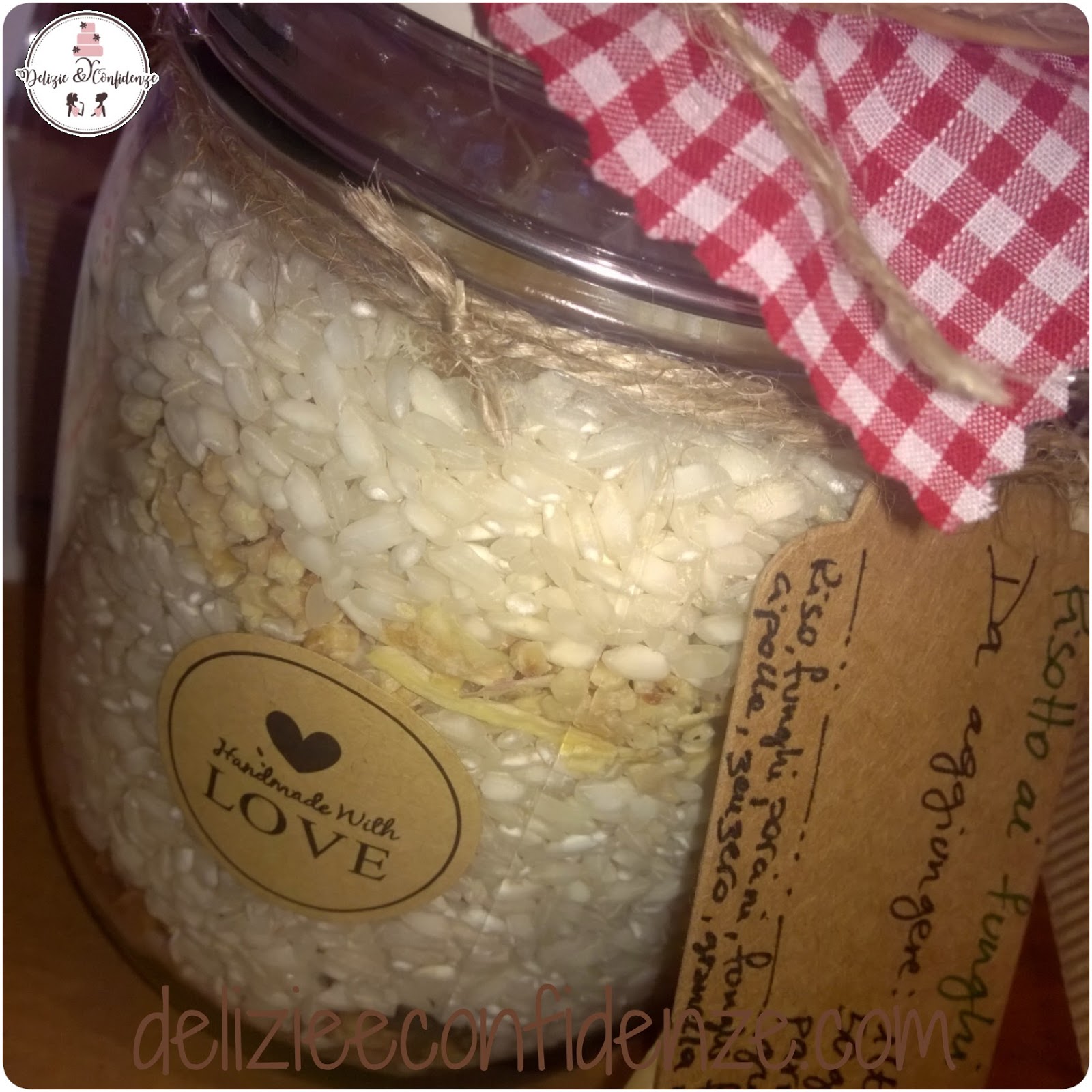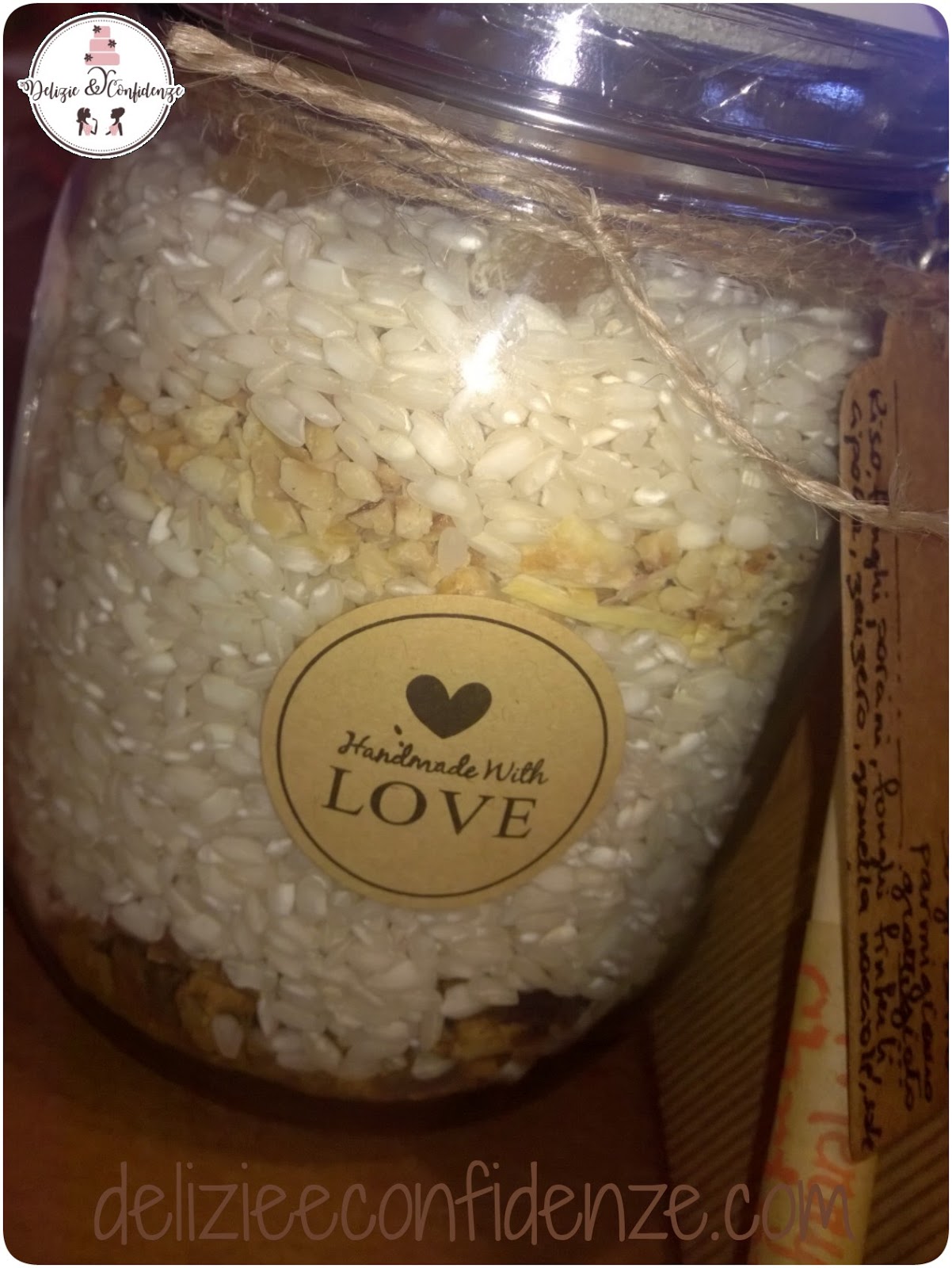 Alternare in un barattolo uno strato di riso con uno strato di funghi secchi e la cipolla, quindi uno strato di nocciole in granella e lo zenzero; così da creare delle fasce di colore.