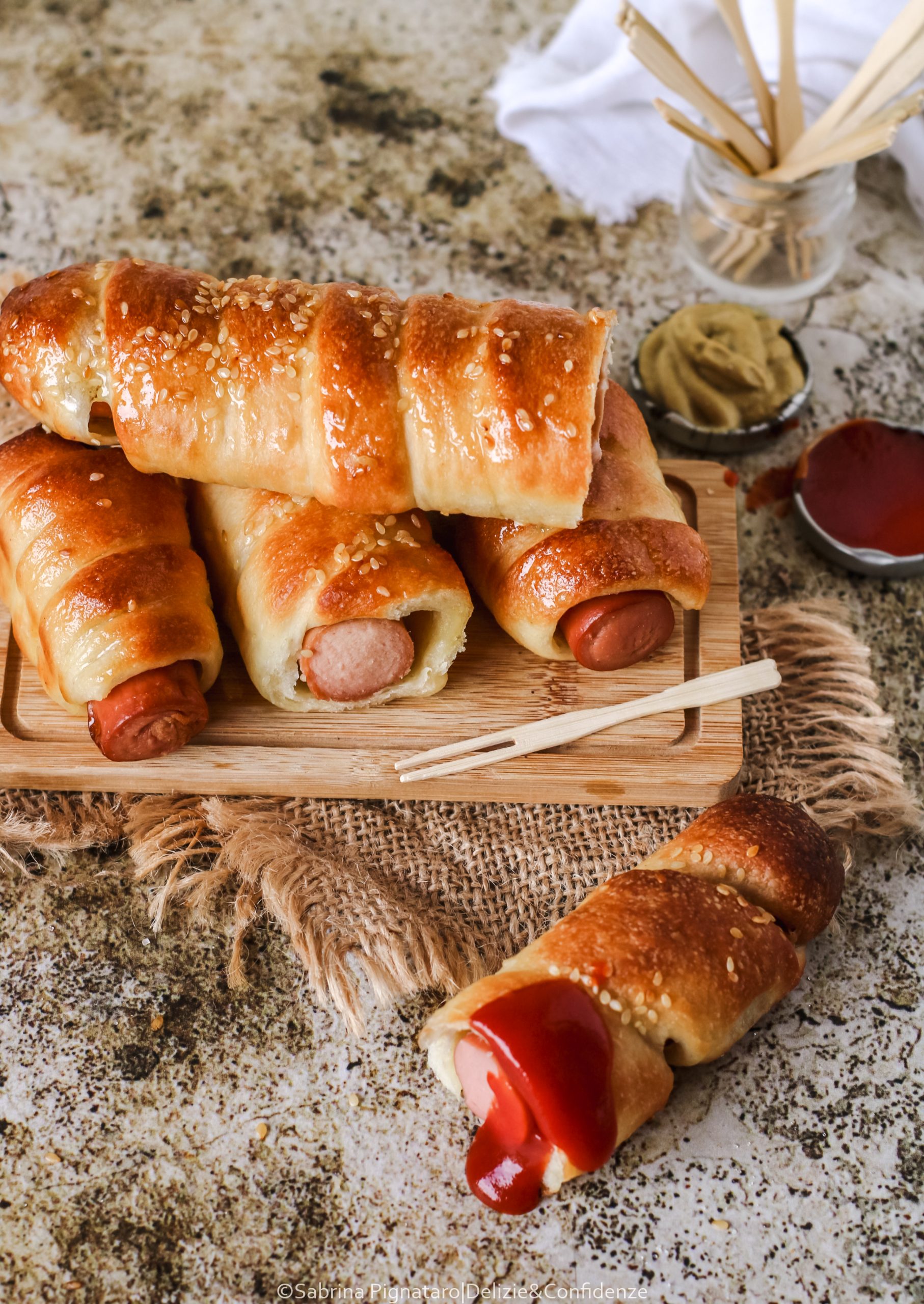 Rollò con würstel, un simil cannolo di pasta brioche neutra, avvolta attorno ad un würstel, un rustico tipico della rosticceria palermitana.