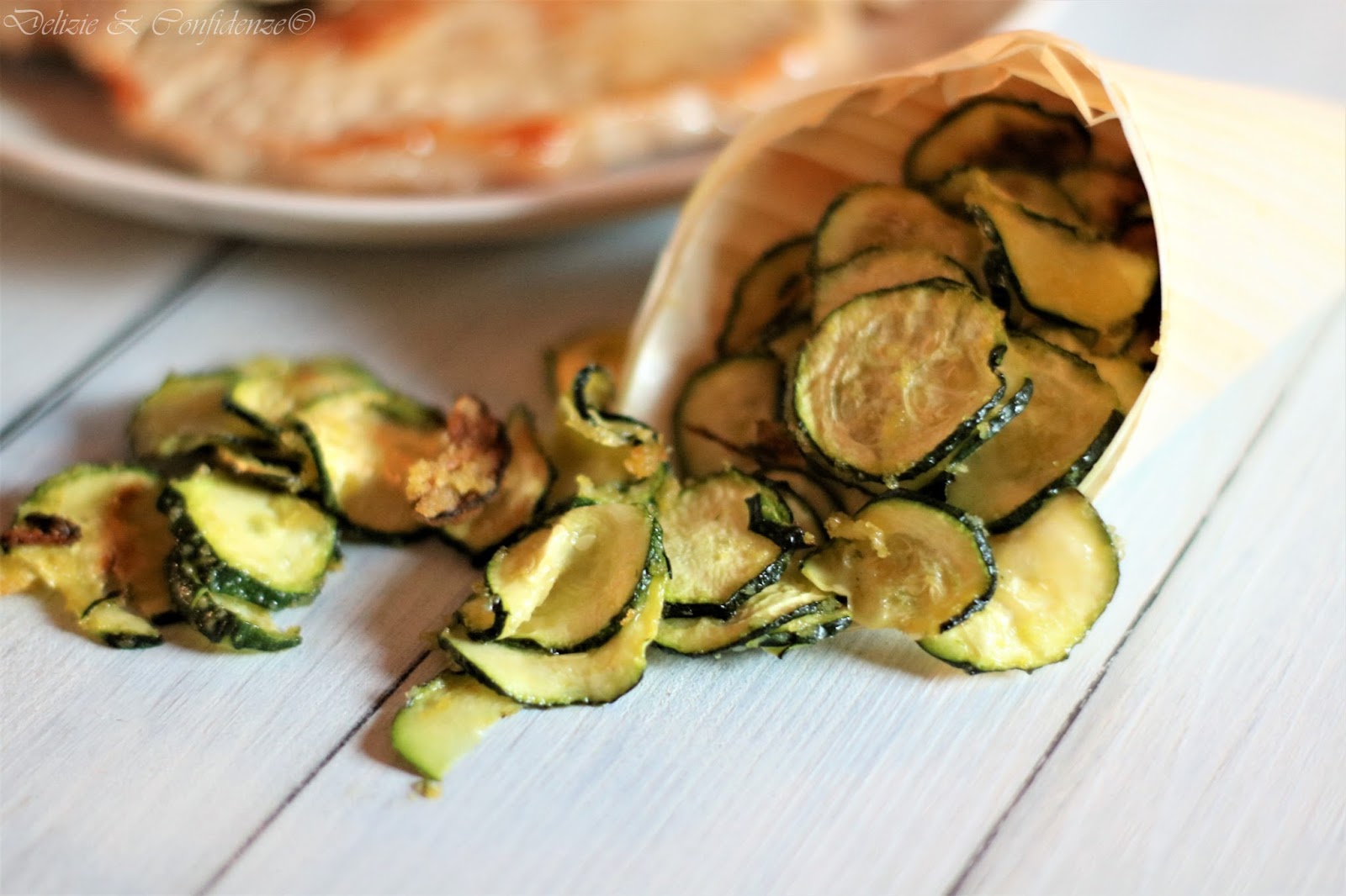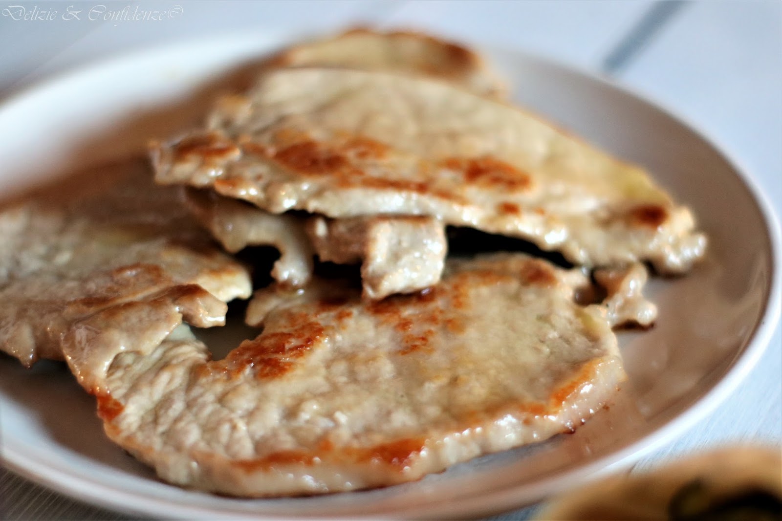 Io l’ho servita accompagnando delle fettine di lonza infarinate e cotte qualche minuto per lato in una noce di burro, e delle chips di zucchine realizzate tagliando a rondelle gli ortaggi, salati e spolverati con impanatura di mais e cotti in forno ventilato fino a doratura.