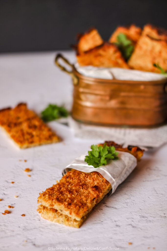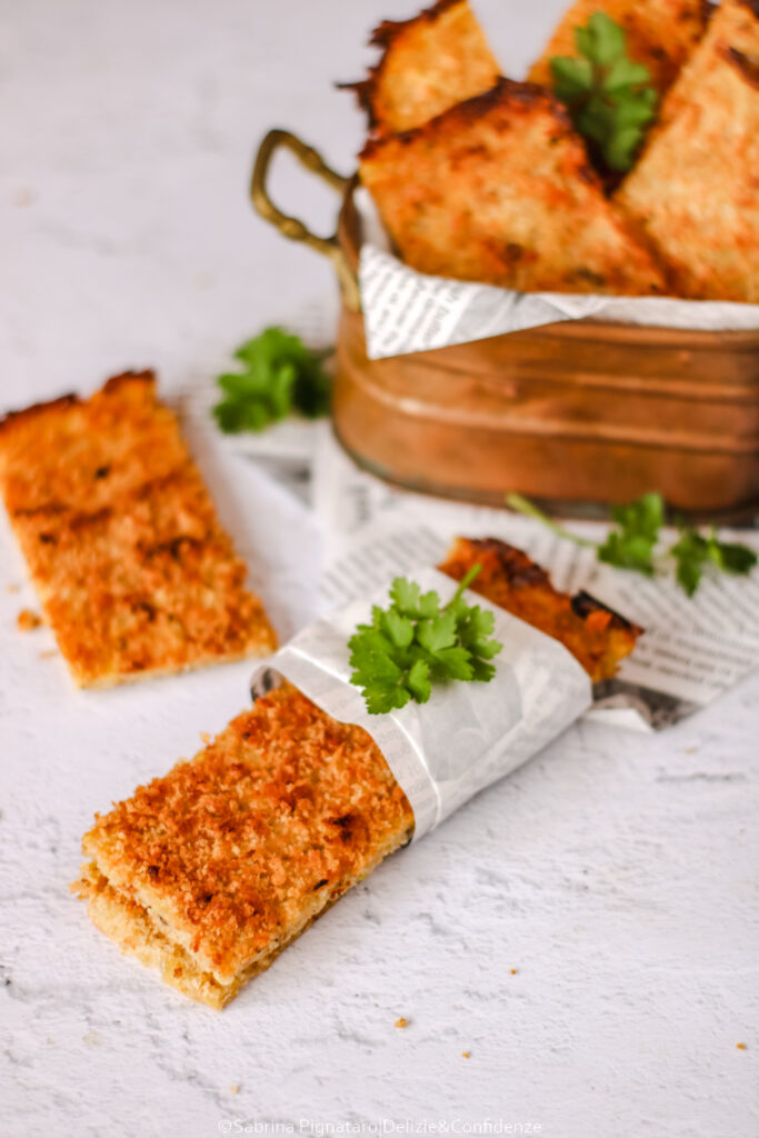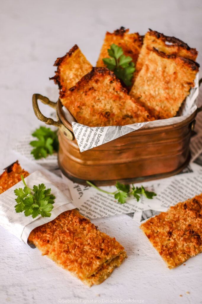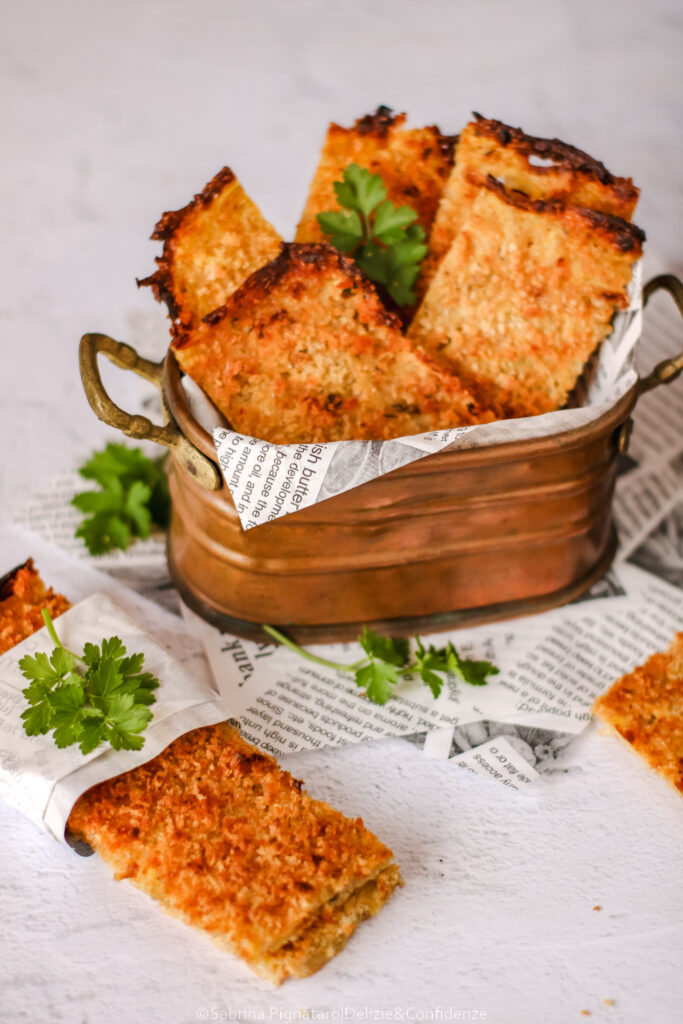 In frigorifero fino a 2–3 giorni in contenitore ermetico; riscaldare in forno per qualche minuto per ripristinare la croccantezza.