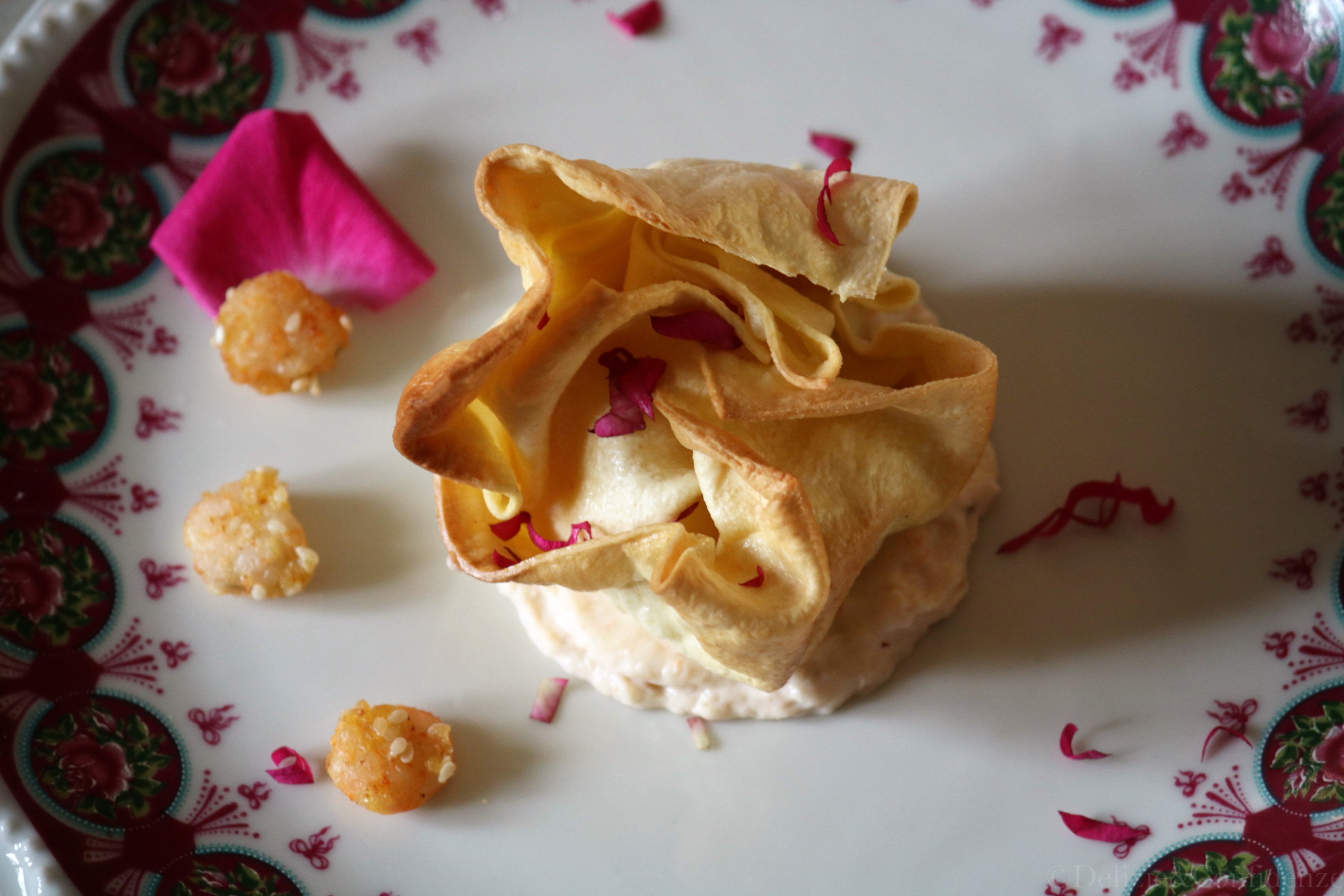 Gli scrigni di mare sono dei saccottini di lasagne ripieni di una delicata crema al mascarpone con salmone e gamberetti, e serviti con gamberetti piccanti e croccanti al sesamo e petali di rosa