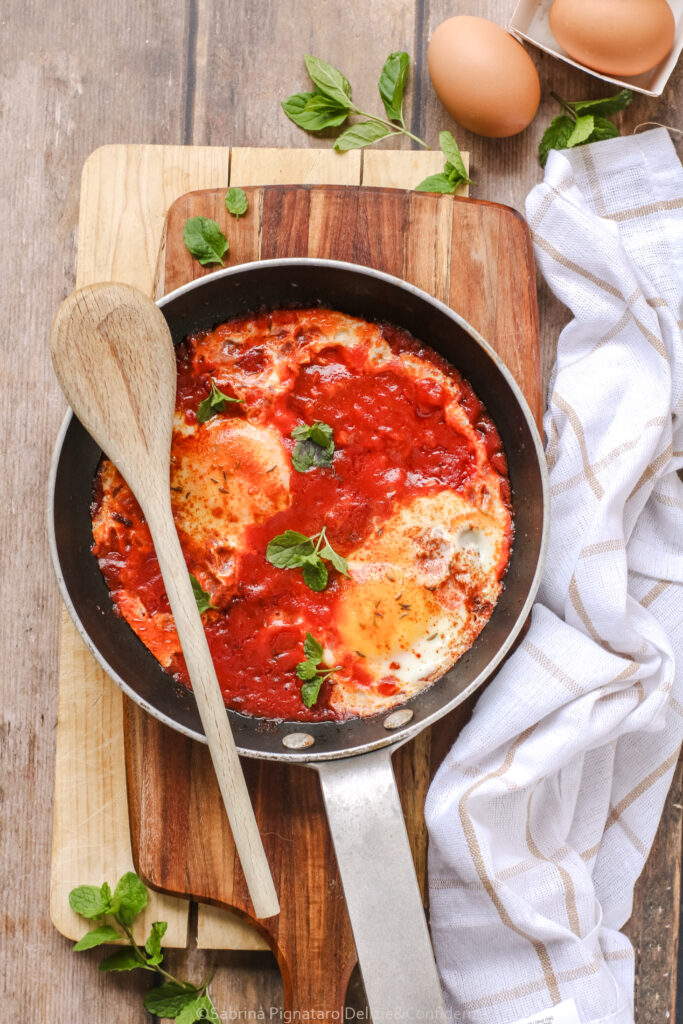 Una volta che il sugo è ben denso e saporito, si fanno “cadere” sopra, delicatamente, le uova che cuoceranno nel sugo fino a raggiungere una consistenza leggermente rapprensiva.
