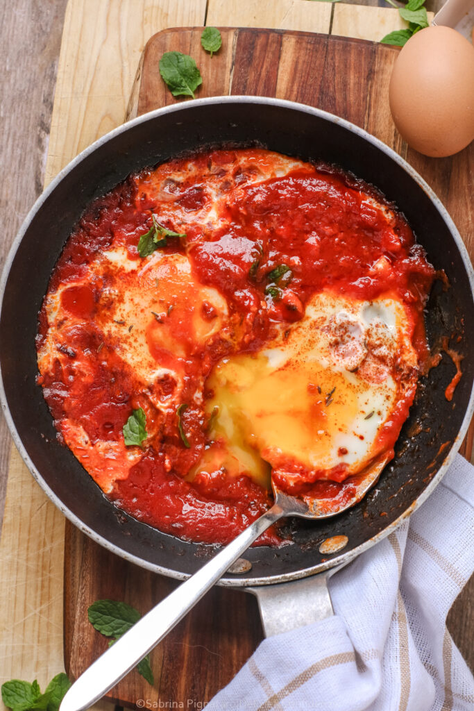 Le uova, che cuociono delicatamente nella salsa, diventano il cuore del piatto, creando un contrasto meraviglioso con il sugo denso e saporito.
