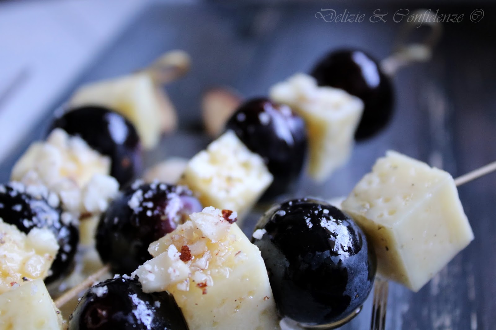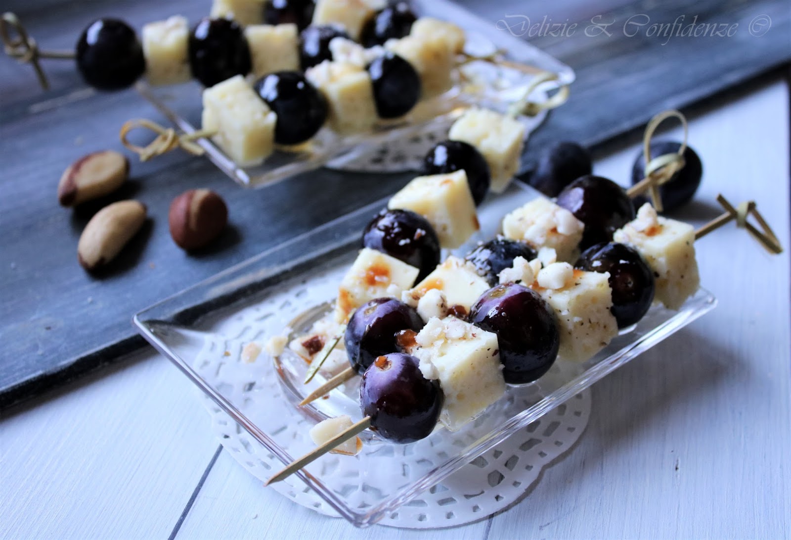 Spiedini di uva e pecorino con noci del Brasile