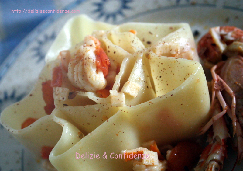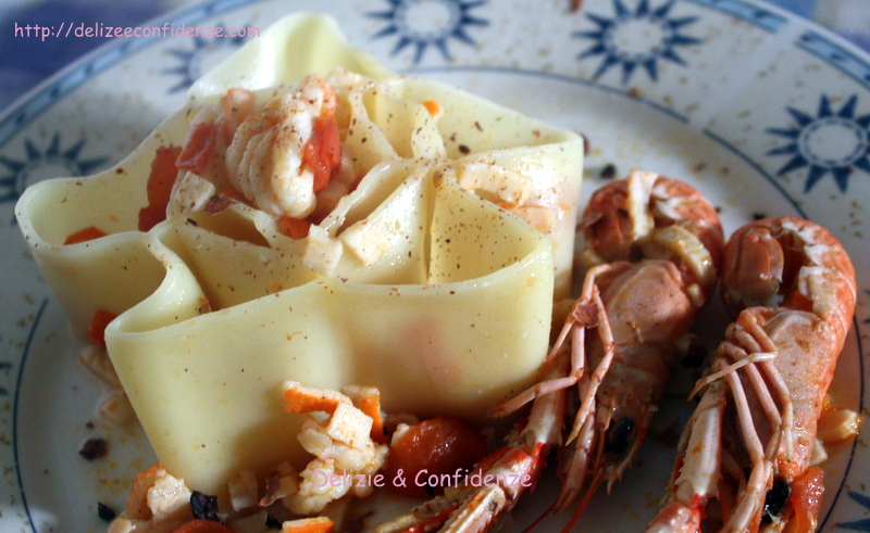 Impiattare la pasta e condire con la salsa di crostacei, decorando con i gamberoni lasciati interi.