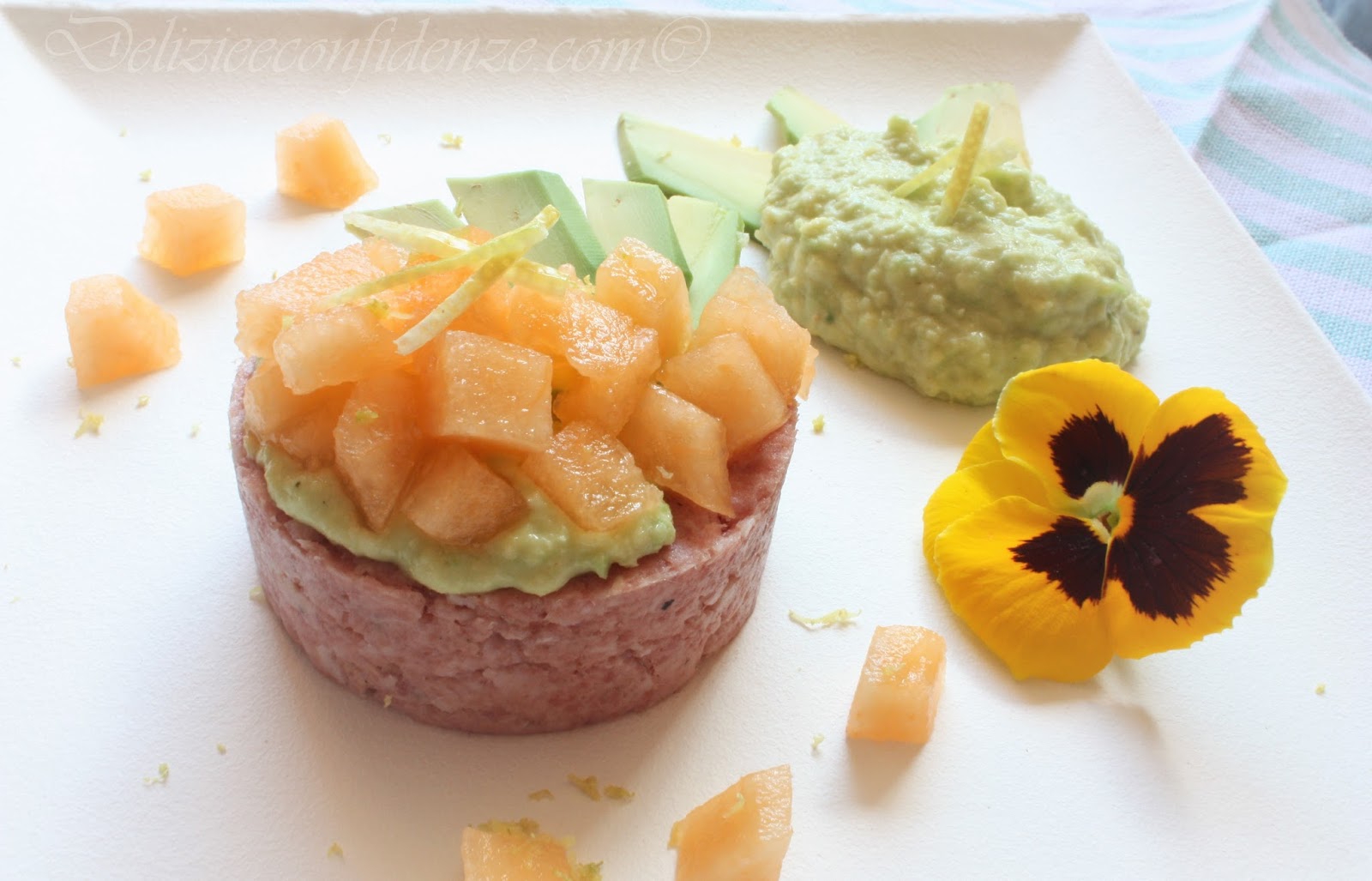 Coprire la tartare con una parte della crema di avocado e il melone tagliato a dadini piccoli (sbucciato e privato dei semi).