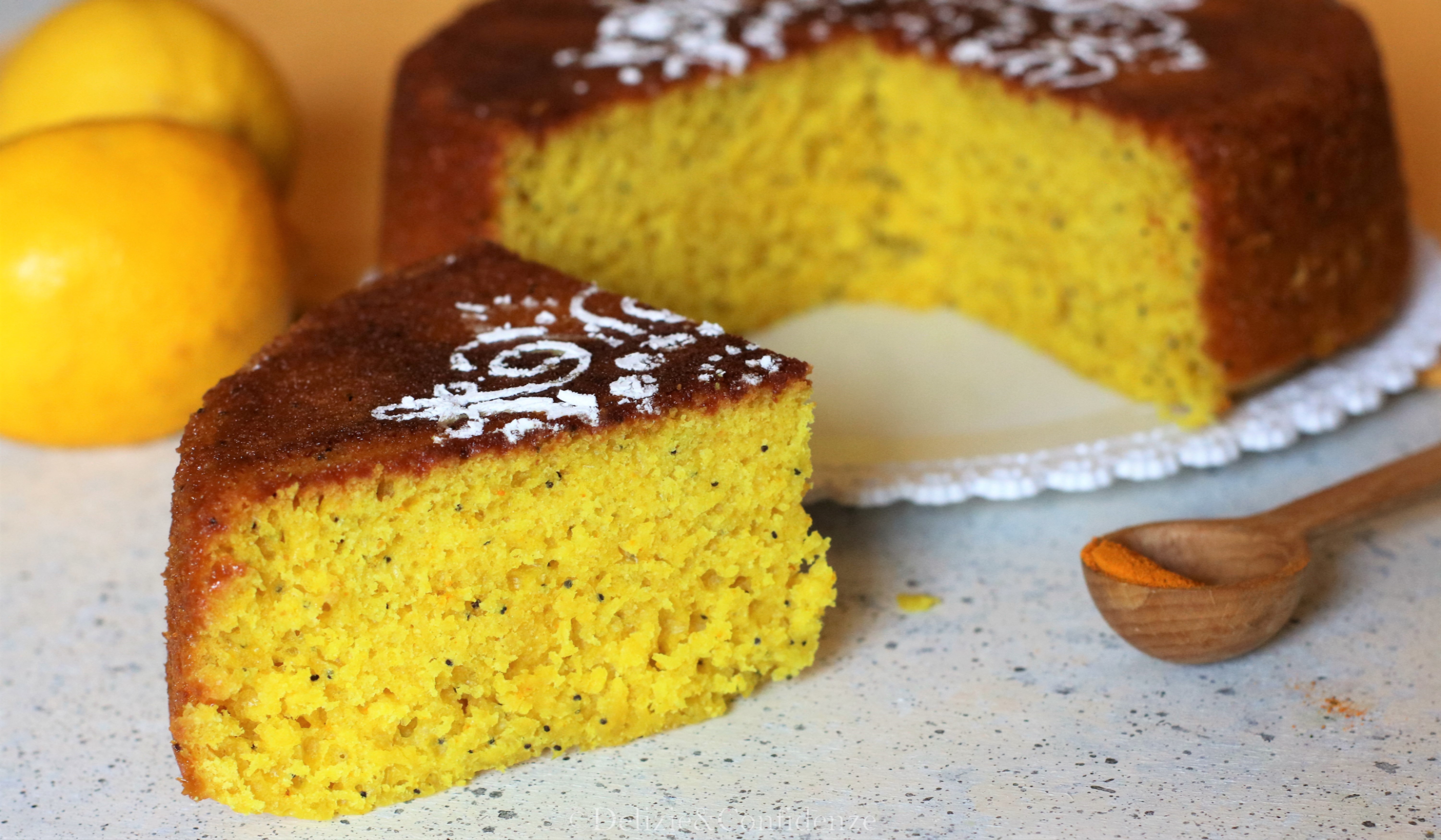 Torta in pentola al sapore di limonata, curcuma e semi di papavero (senza uova, senza burro, senza latte e senza zucchero)