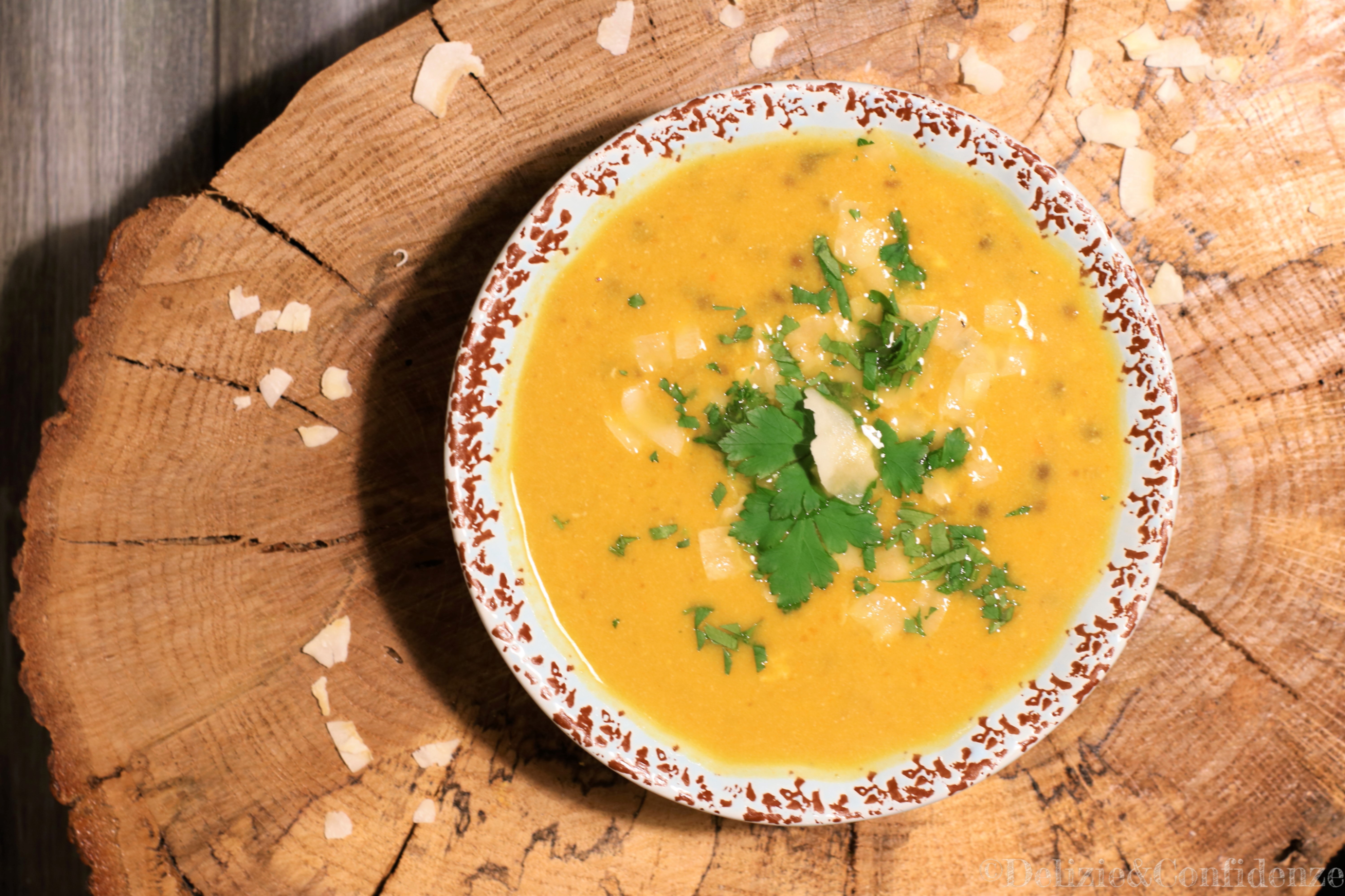 Calda ed avvolgente zuppa con lenticchie, zucca e latte di cocco. Un piatto speziato e delicato ottimo anche da servire nei giorni di festa